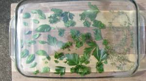 Transfer the picked herbs to a wooden cutting board and place a glass baking dish over top (make sure to let part of the dish hang over the edge so that air can flow up and into the “dehydration chamber”).