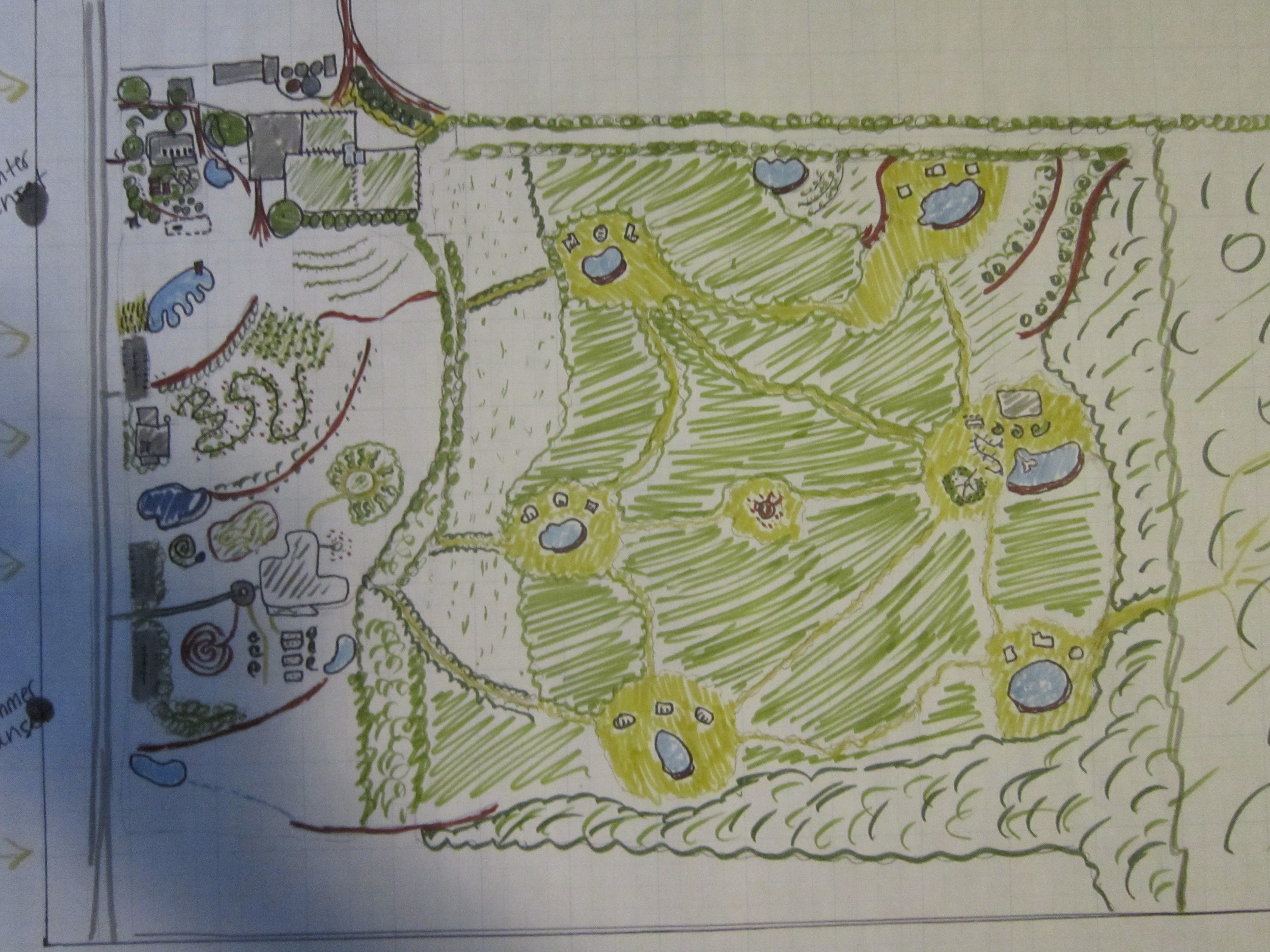 And of course, a permaculture design certificate wouldn’t be complete without some designing.  The picture below is a conceptual plan for a 50-acre permaculture learning center with a holisitc health clinic and farm-to-table restaurant.  The space to the right is a wheel of intern housing (planned around water retention features and constructed using natural building styles, of course!).  The top left is the house and barn, and other features below were outlined in more detail by other group members.