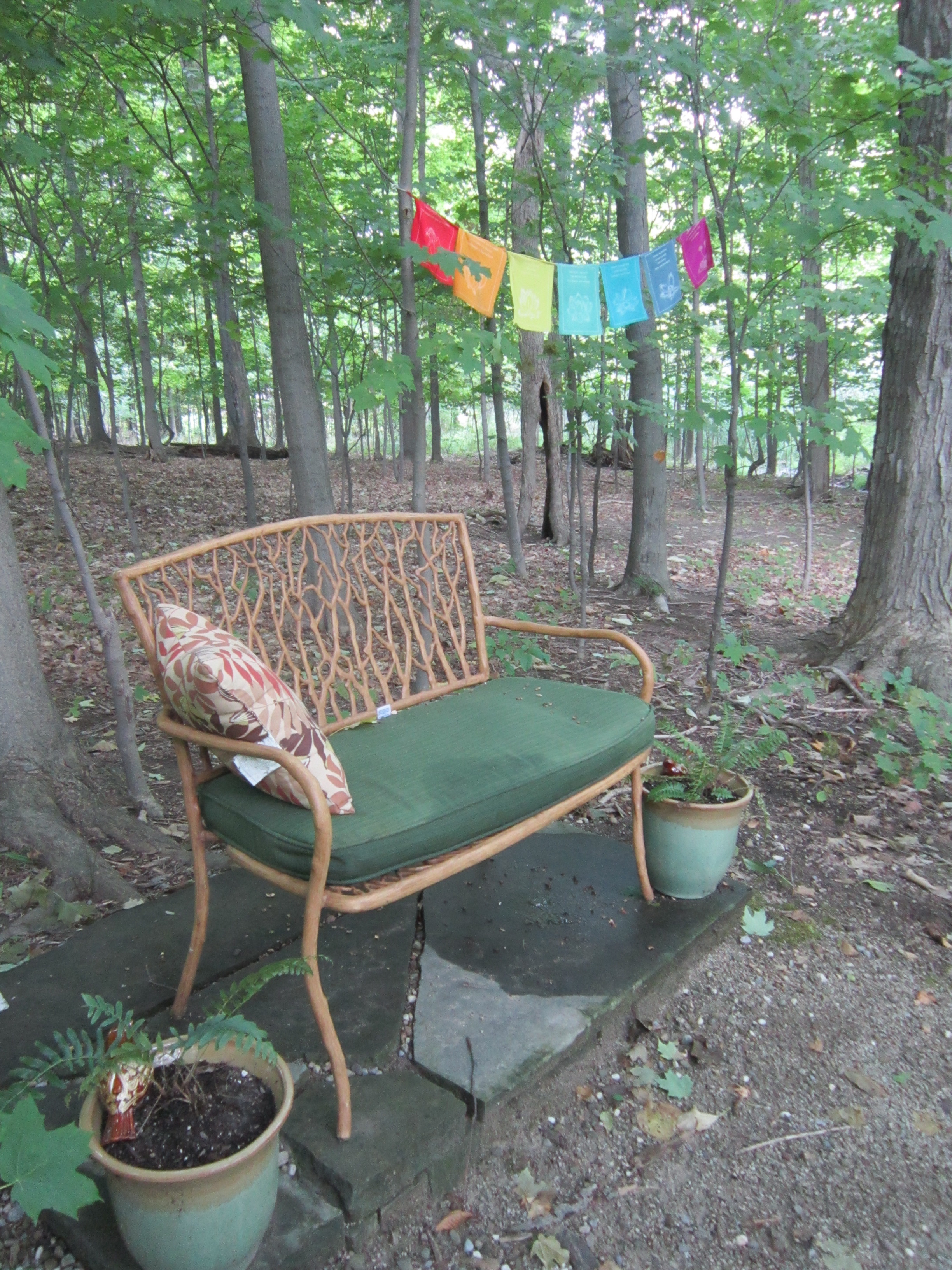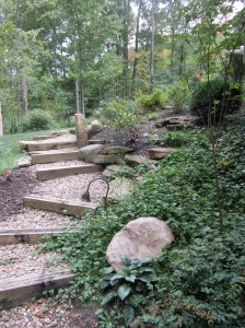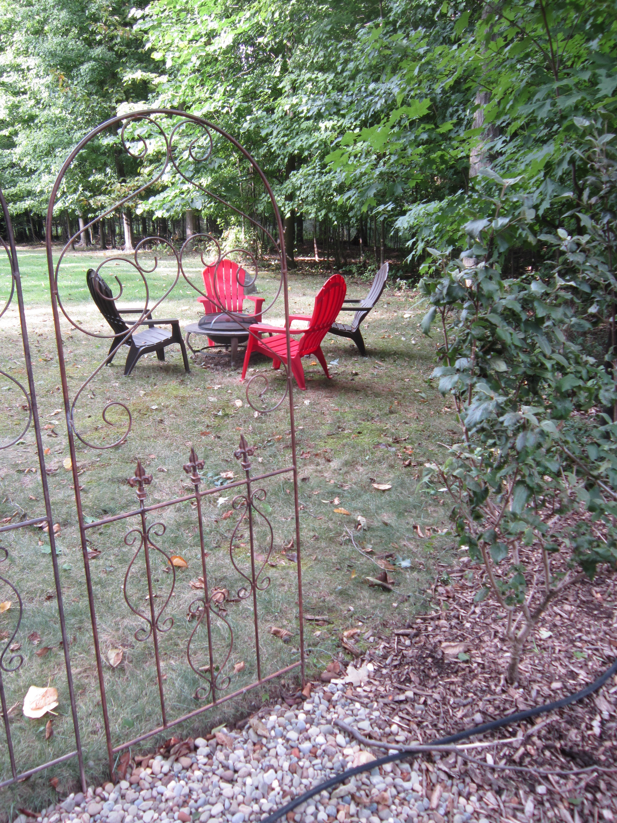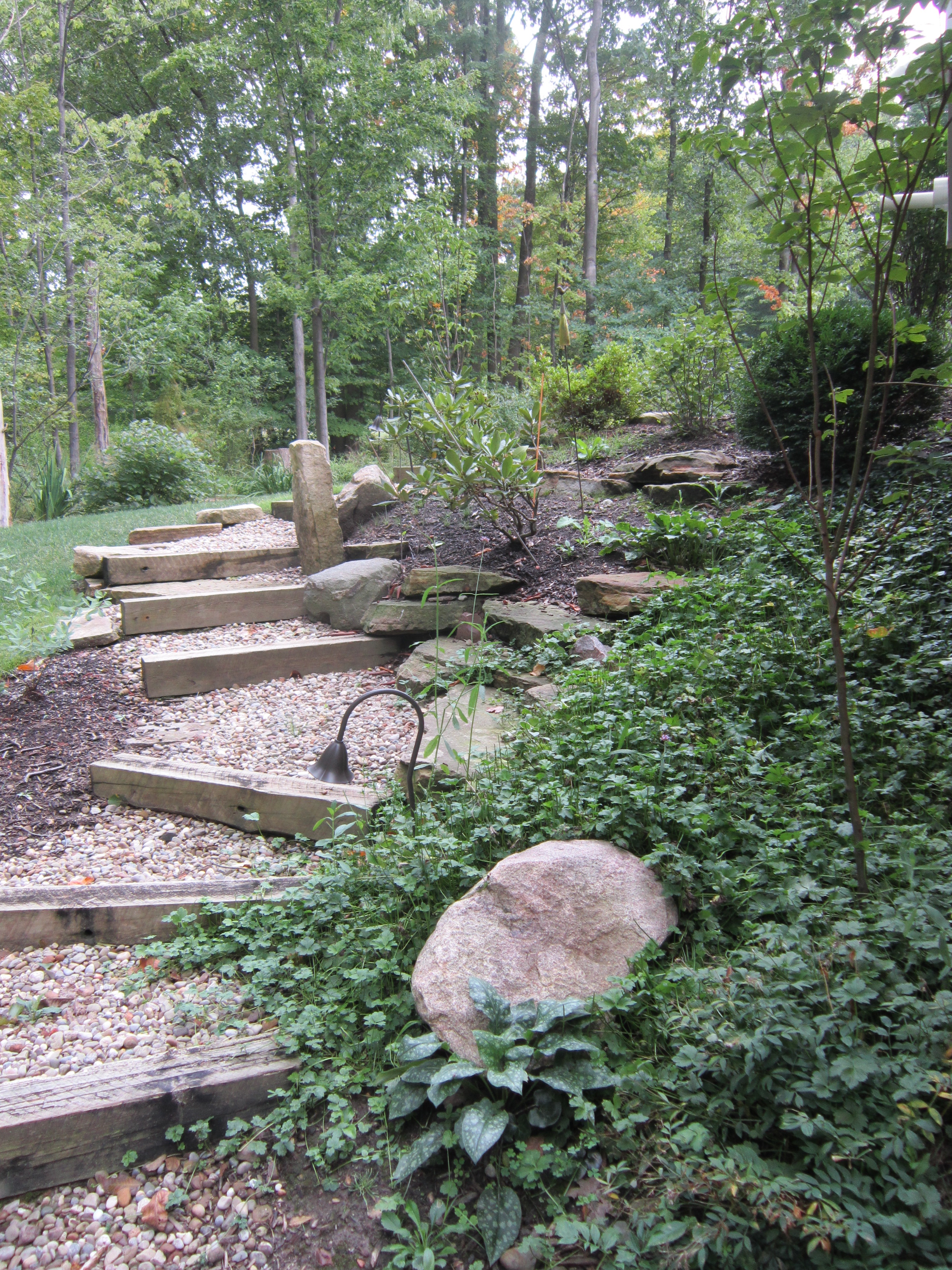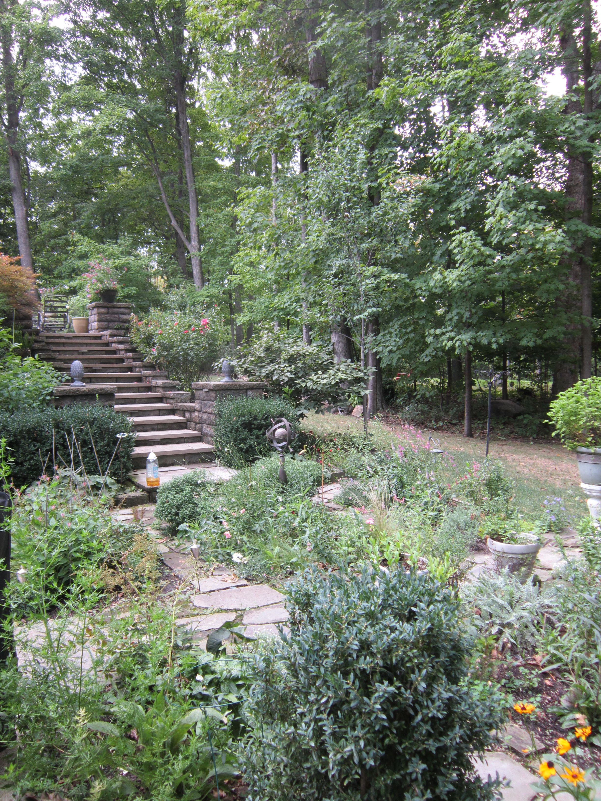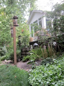 “The back yard was all grass other than woods that had been left uncleared (thankfully) and a mound where the septic tanks are. There were wooden steps leading down into the yard and a small concrete path that led off the drive and back into the garage. Nothing made me feel connected to nature in the yard. This had to change because we love summer days and evenings outside and I love plants, flower gardens, and watching birds and butterflies.