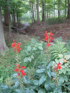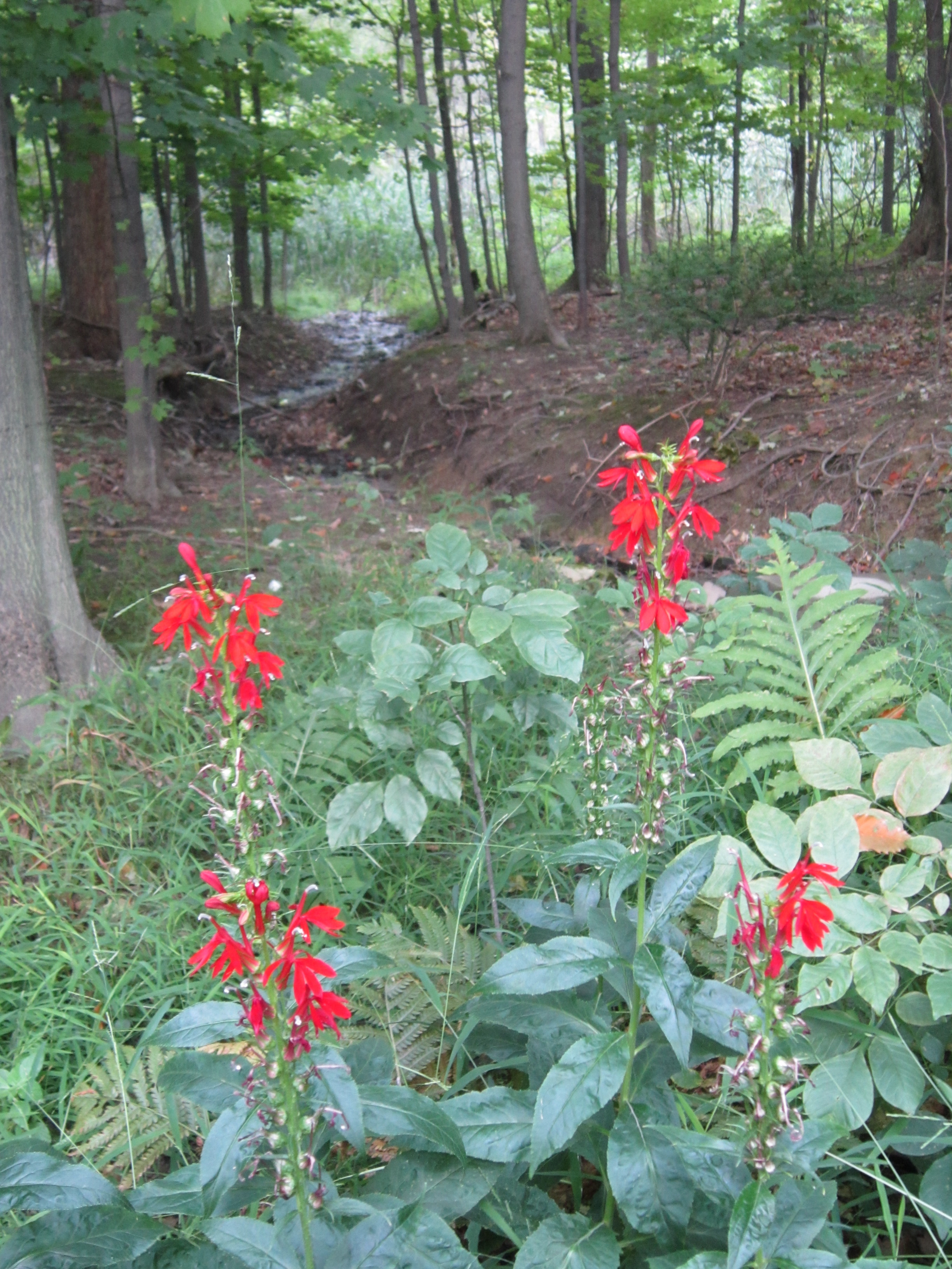 Cardinal flowers planted at the edge of the woods where a creek runs out of the property. Beautiful for humans, good for wildlife.