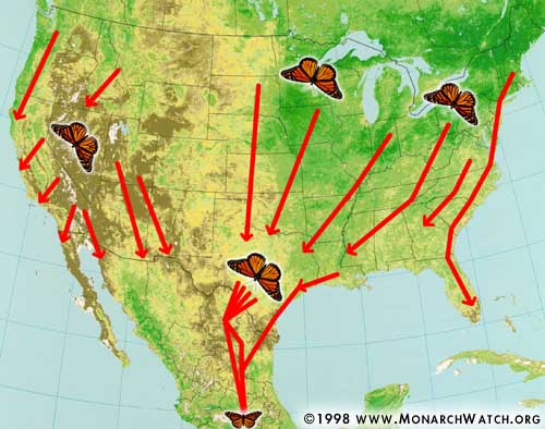 Monarchs starting in the northern regions of the U.S. and even into Canada will be traveling to winter roosting sites in the mountains of Mexico.  There are also smaller populations of monarchs west of the Rocky Mountains that migrate to roosting sites along the California coast.  These great grandchildren (!) of the monarchs who made their way up from Mexico in the Spring often return to the same area that their great grandparents left.