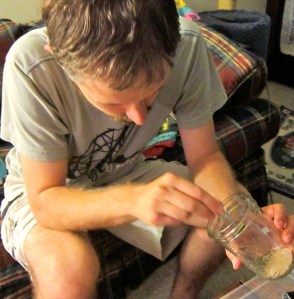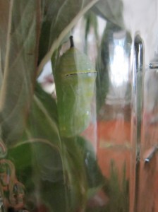 One night before I went to bed, I noticed one of the monarchs hanging from the top of its jar by its hind feet.  This is the classic “J” shape they go into during their last stage as a caterpillar.  It was still like that in the morning, but it’s antennae were beginning to look very withered.  Still, it didn’t seem to be doing much.