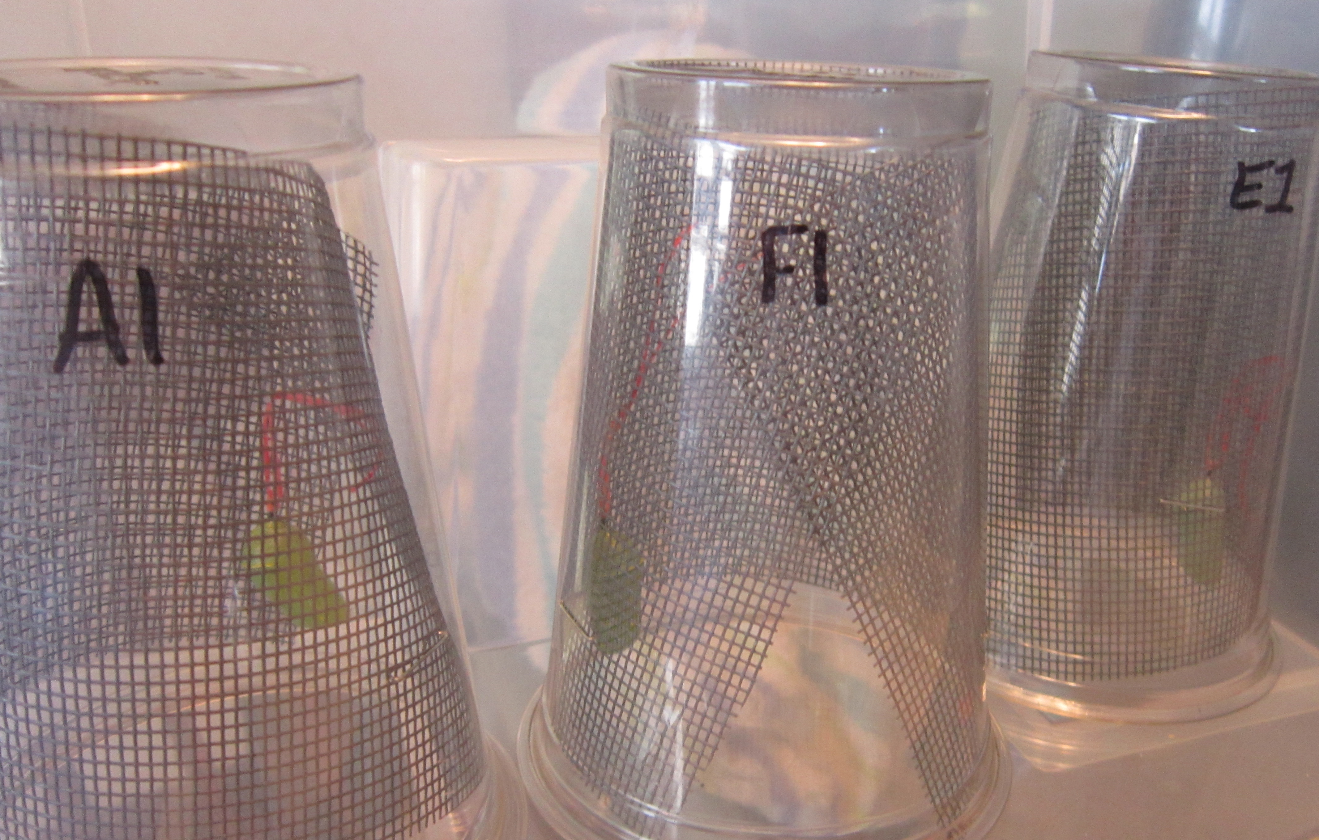 Emergence chambers are easy to construct out of 10 oz. plastic cups lined with screen. I put a small piece of tape on the string and attached it to the screen inside the cups.