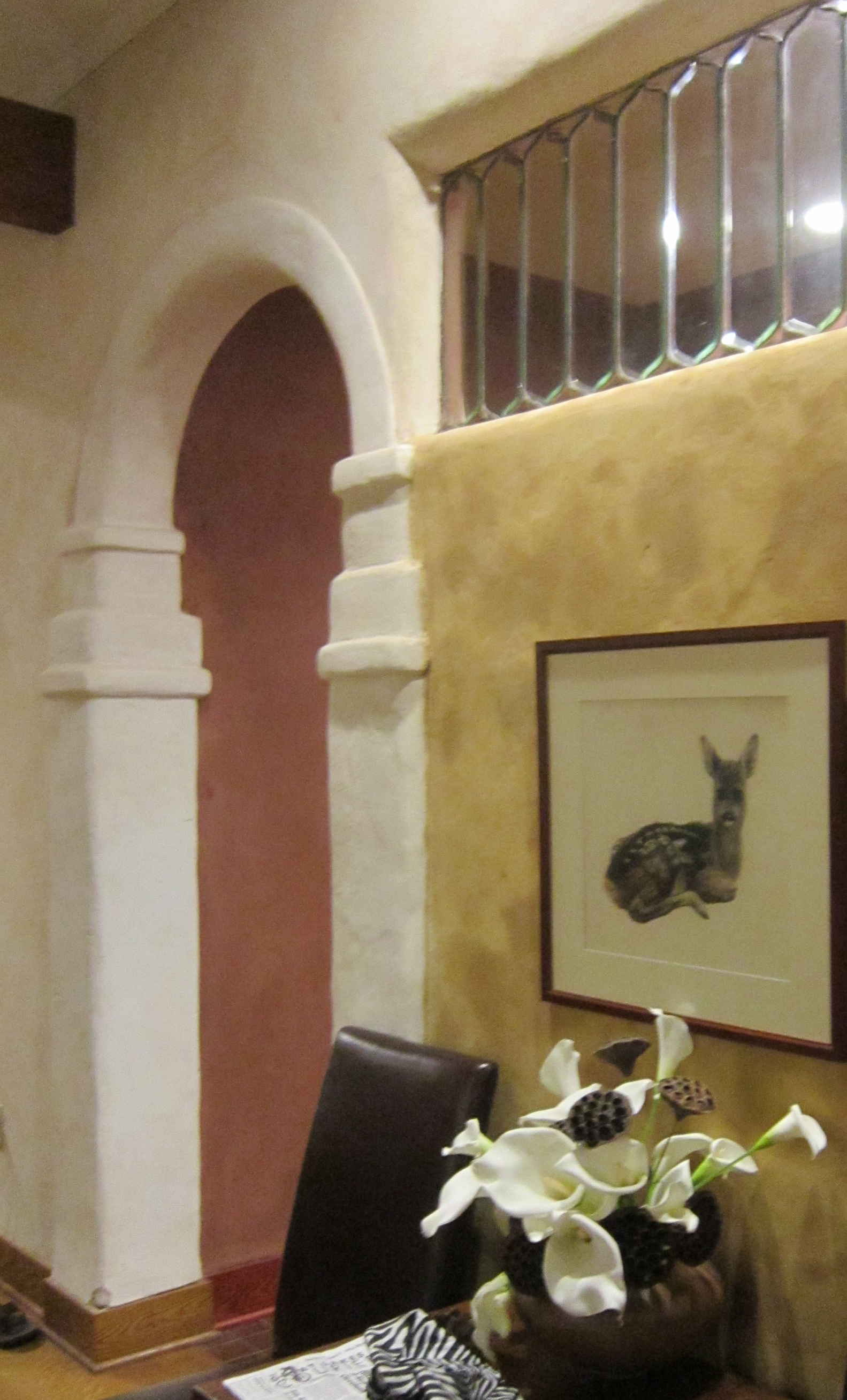 Inside, the feeling of this home is warm, inviting, and peaceful. The natural building theme is continued throughout the home and much of the interior was molded using earth-based plasters that provide a soft feel to arches, walls, and windows.
