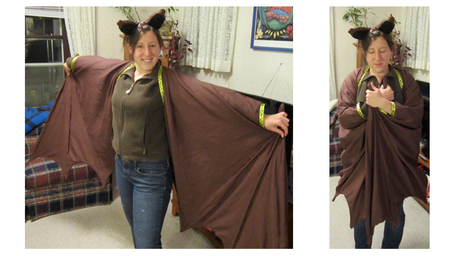 I’m also excited to report on a bat costume I made to use at a series of Halloween events where I’ll be teaching people why bats are awesome and what people can do to help bats (hint: plant native species, protect habitat, avoid pesticides, and consider putting up a bat box!).