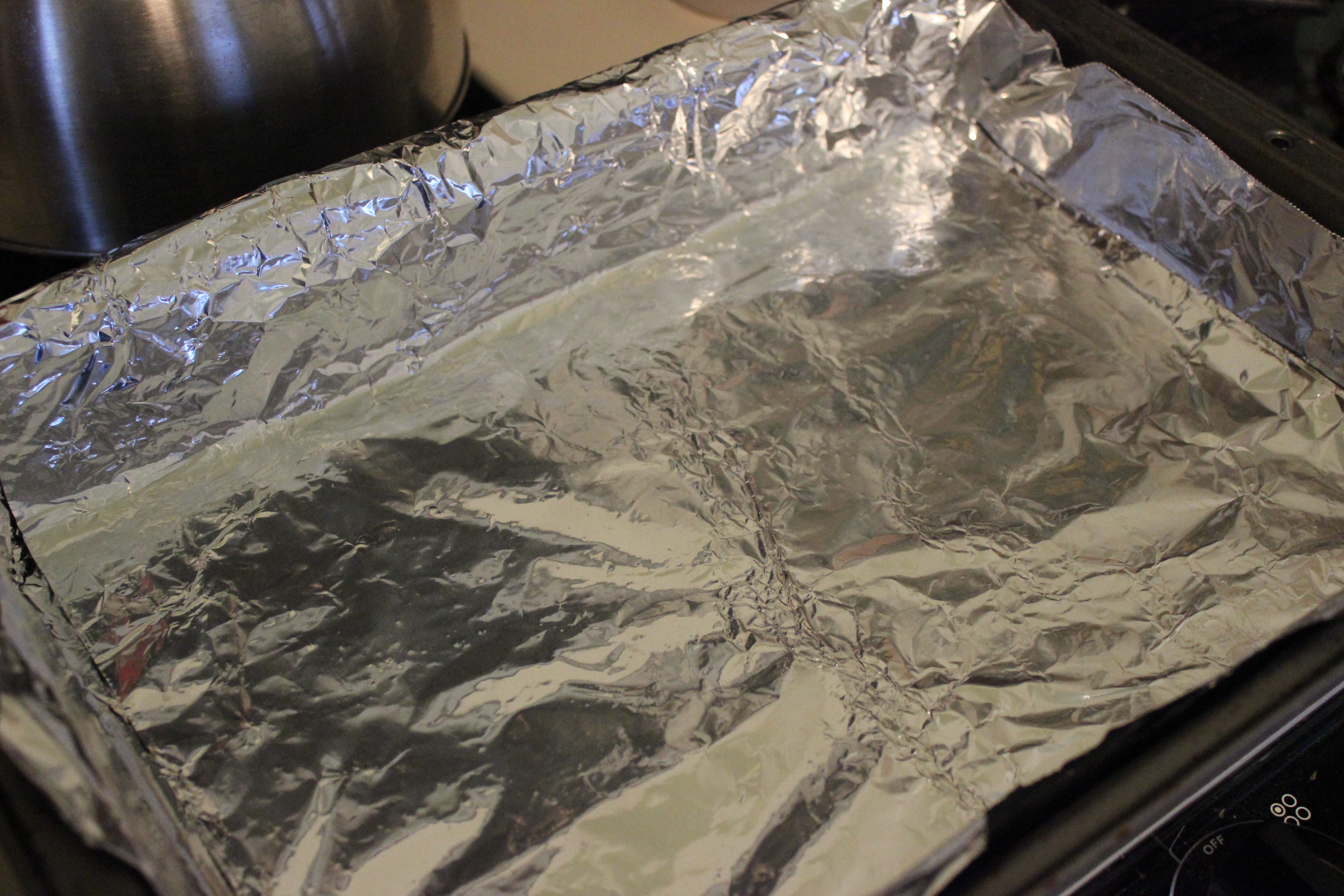 Heat oven to 300 degrees F and have the oven rack in the middle position.  Rip off two long sheets of tinfoil and arrange them perpendicular to one another in a 13 x 9 baking pan, smoothing the foil flush to the pan.  Grease with vegetable oil.