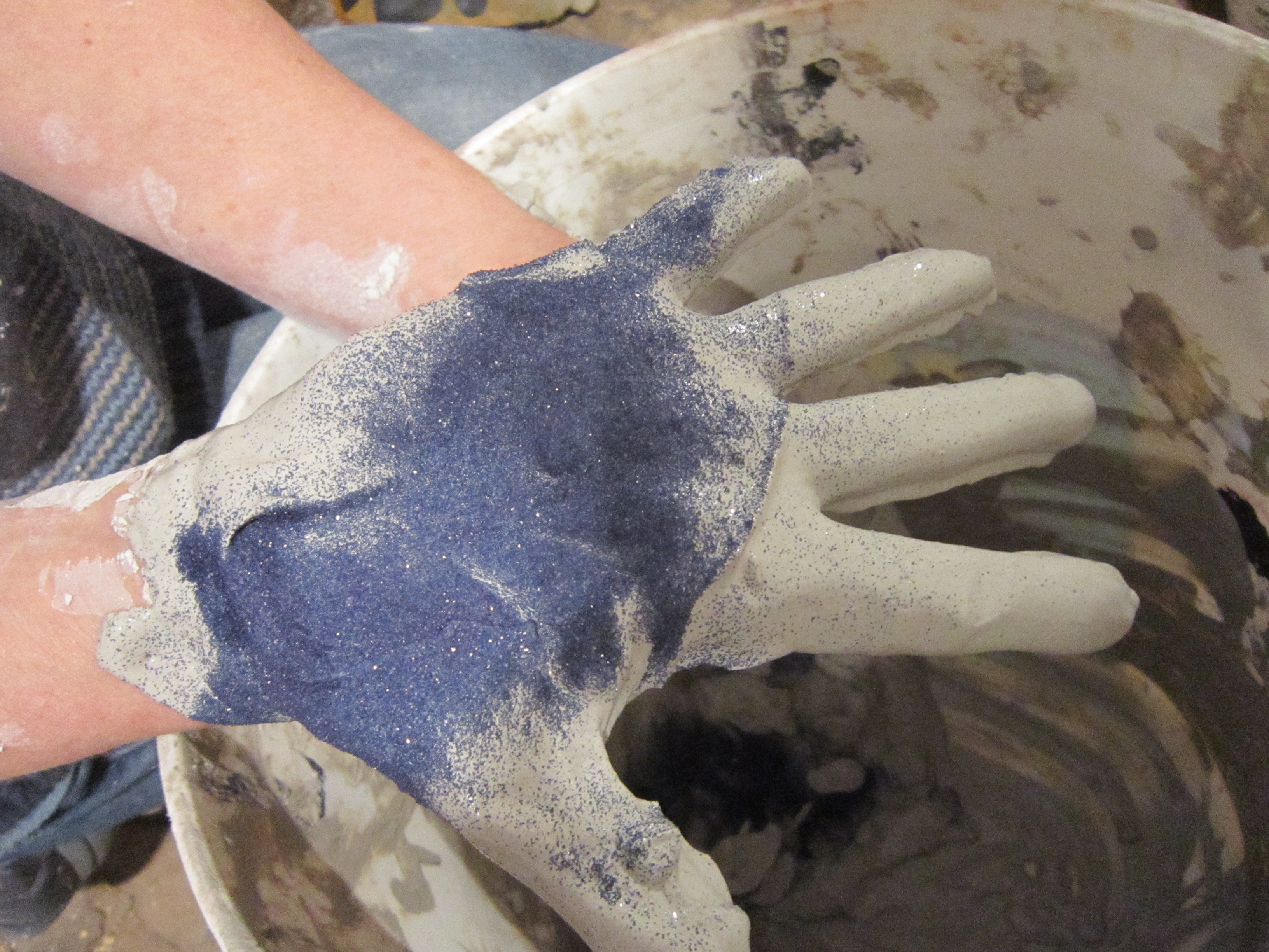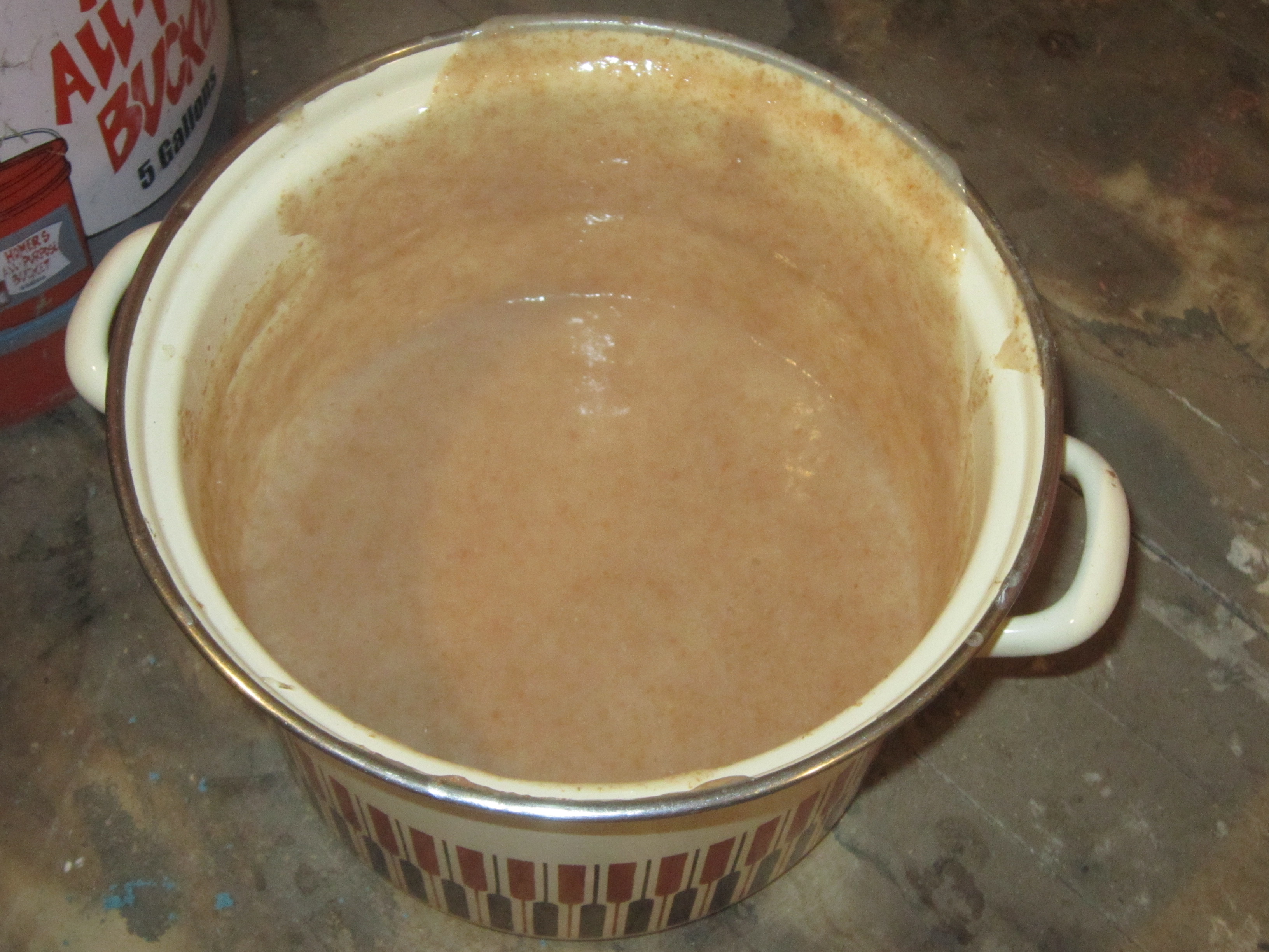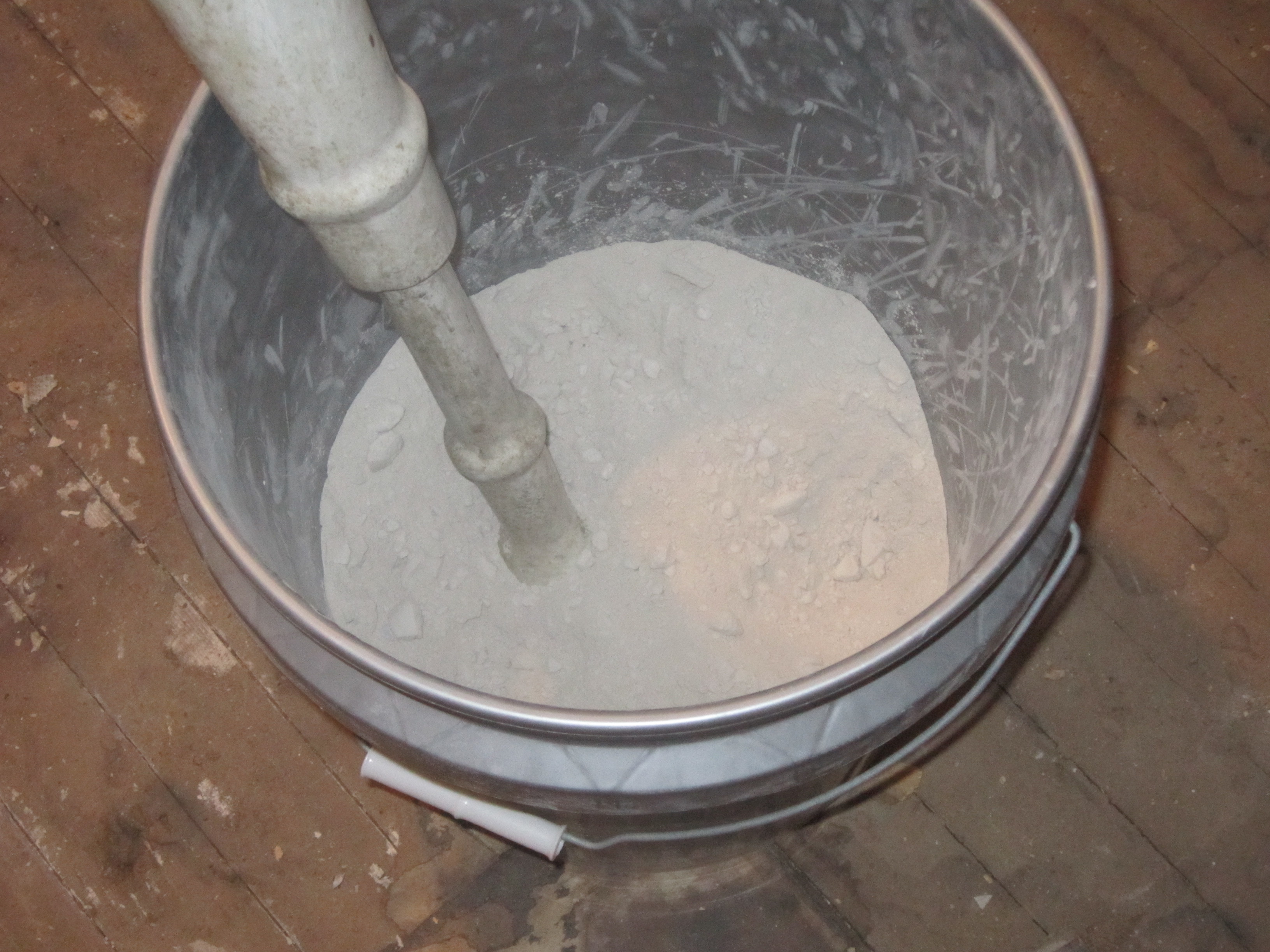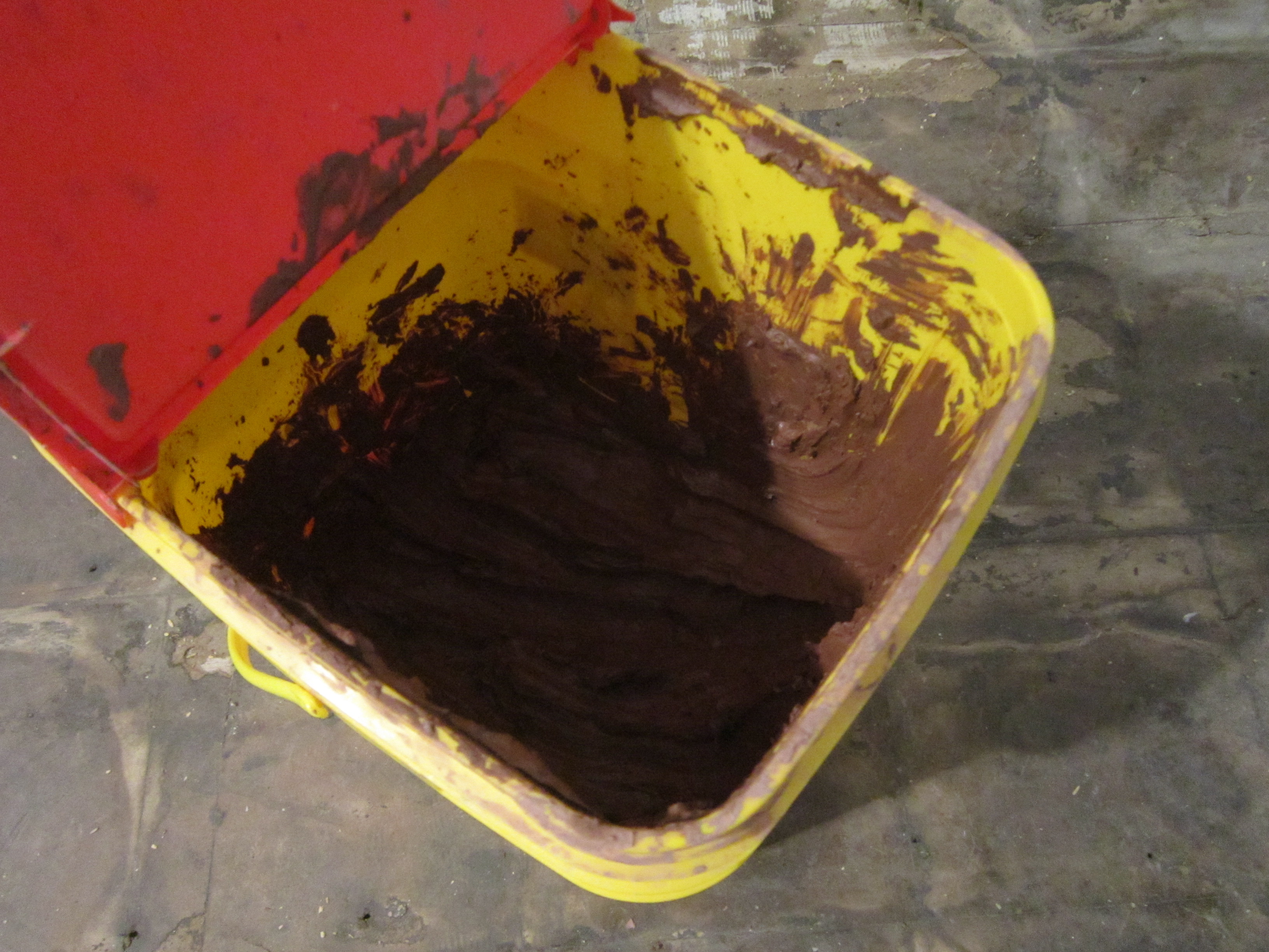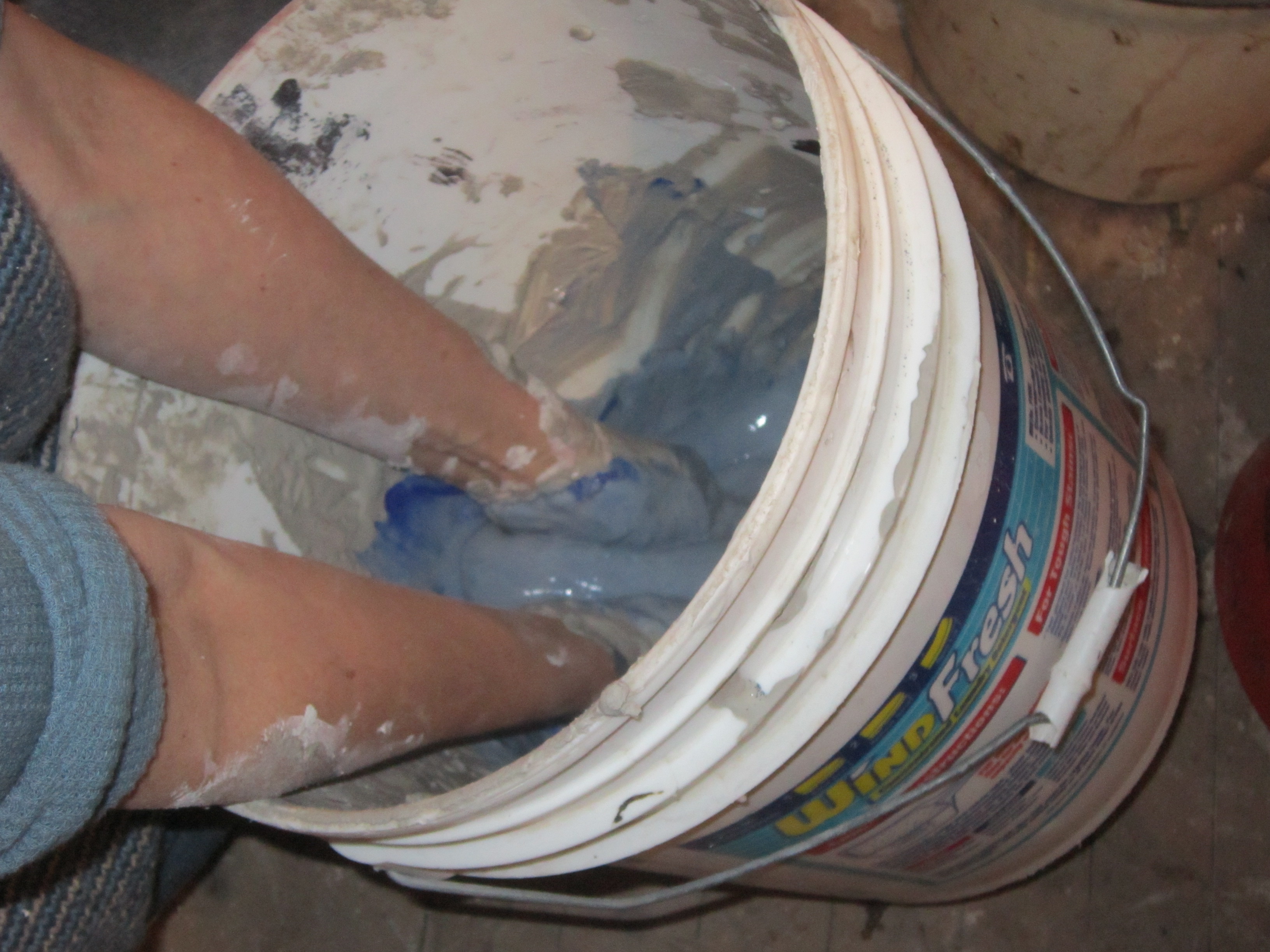 To make the powder, we basically just smashed the heck out of the pottery pieces! We put them into a 5 gallon bucket and used a piece of metal (actually it was an old leg of a table) to pound them down. There were still a few larger chunks left, but we worked them out with our hands after adding a bit of water (and if it isn’t done perfectly, it adds a little extra texture that looks kind of cool in my opinion!). Also, we found that adding a touch of sand to the clay helped to create a bit of abrasion that worked more of the chunks out.