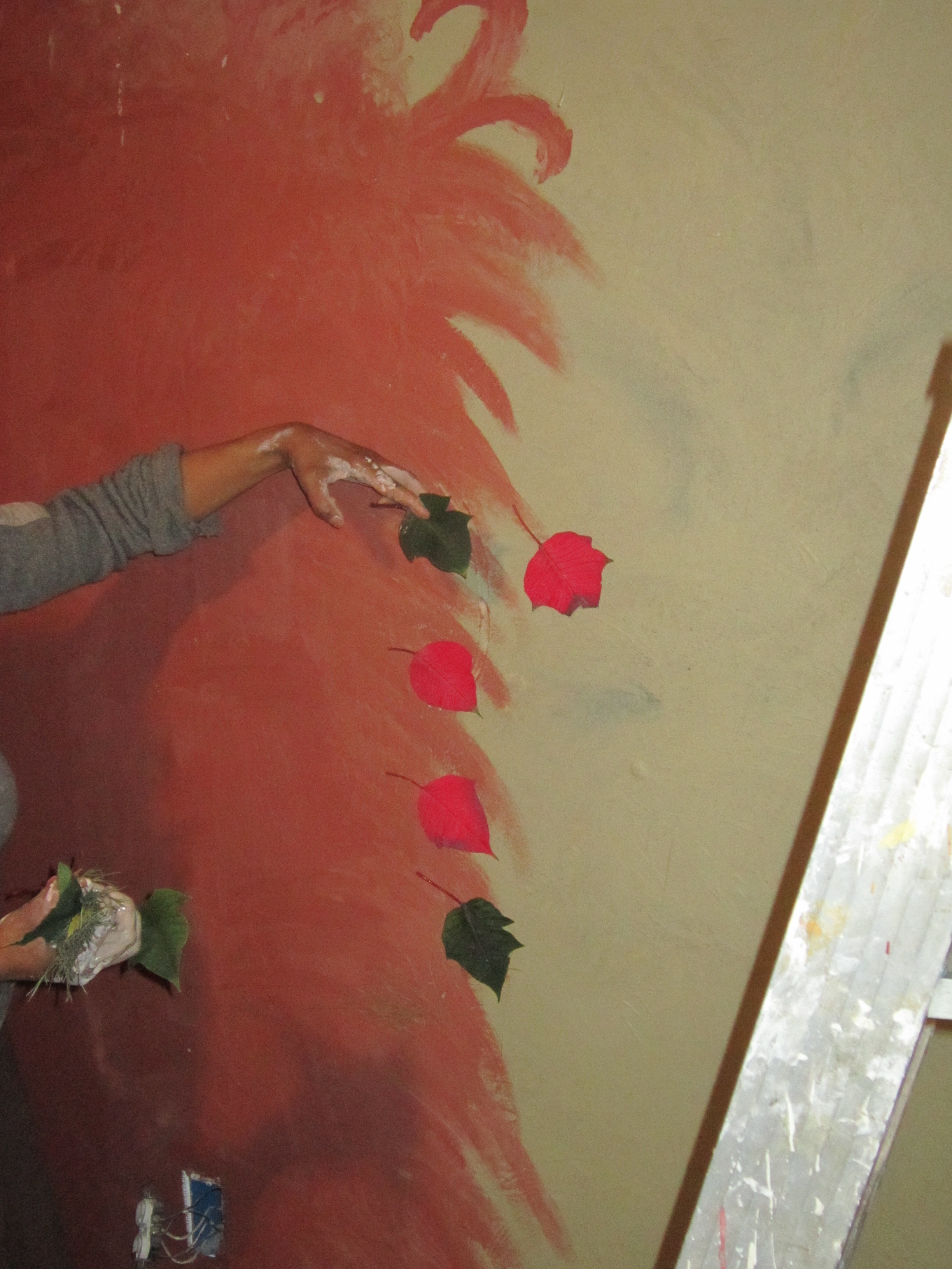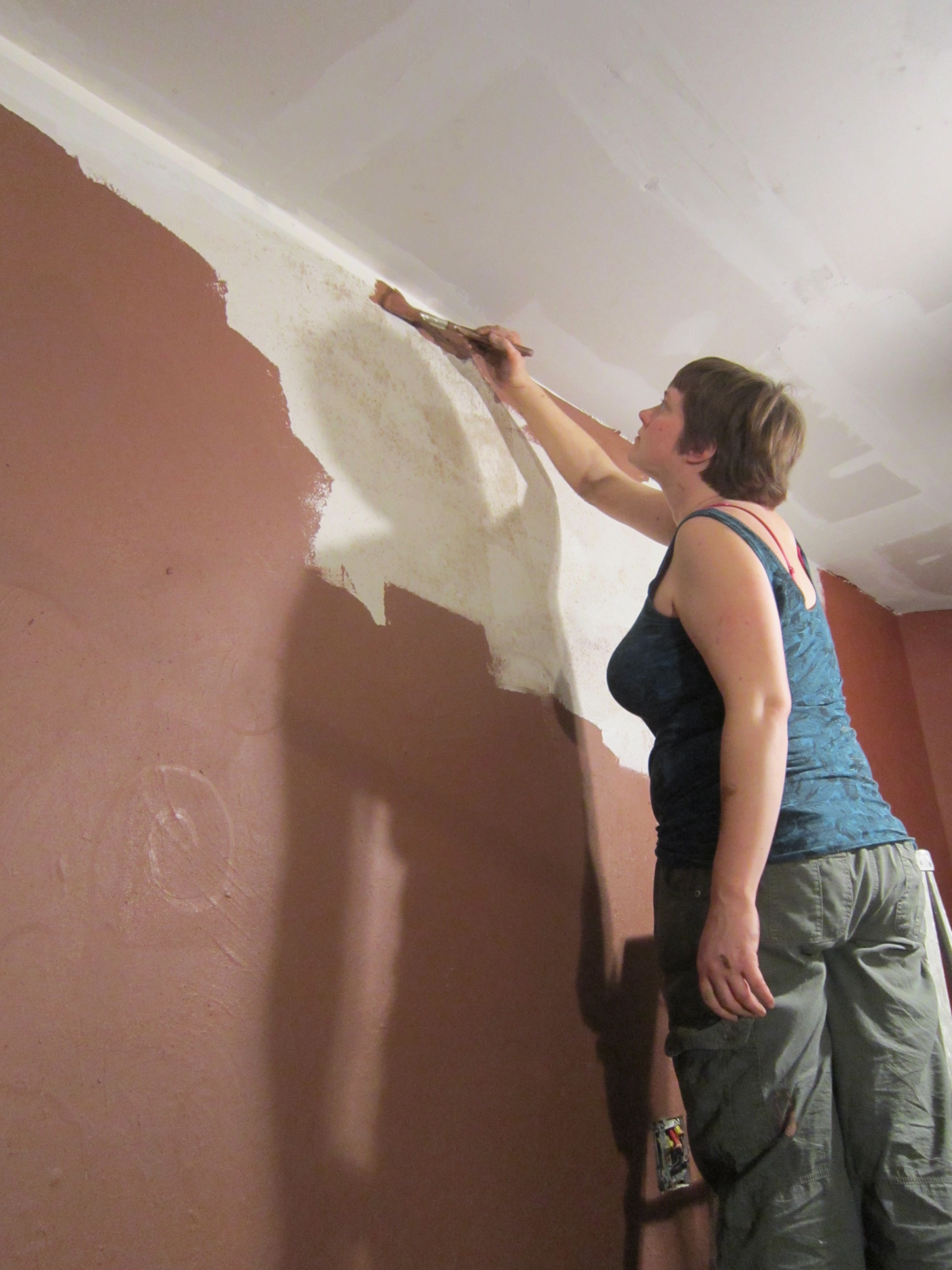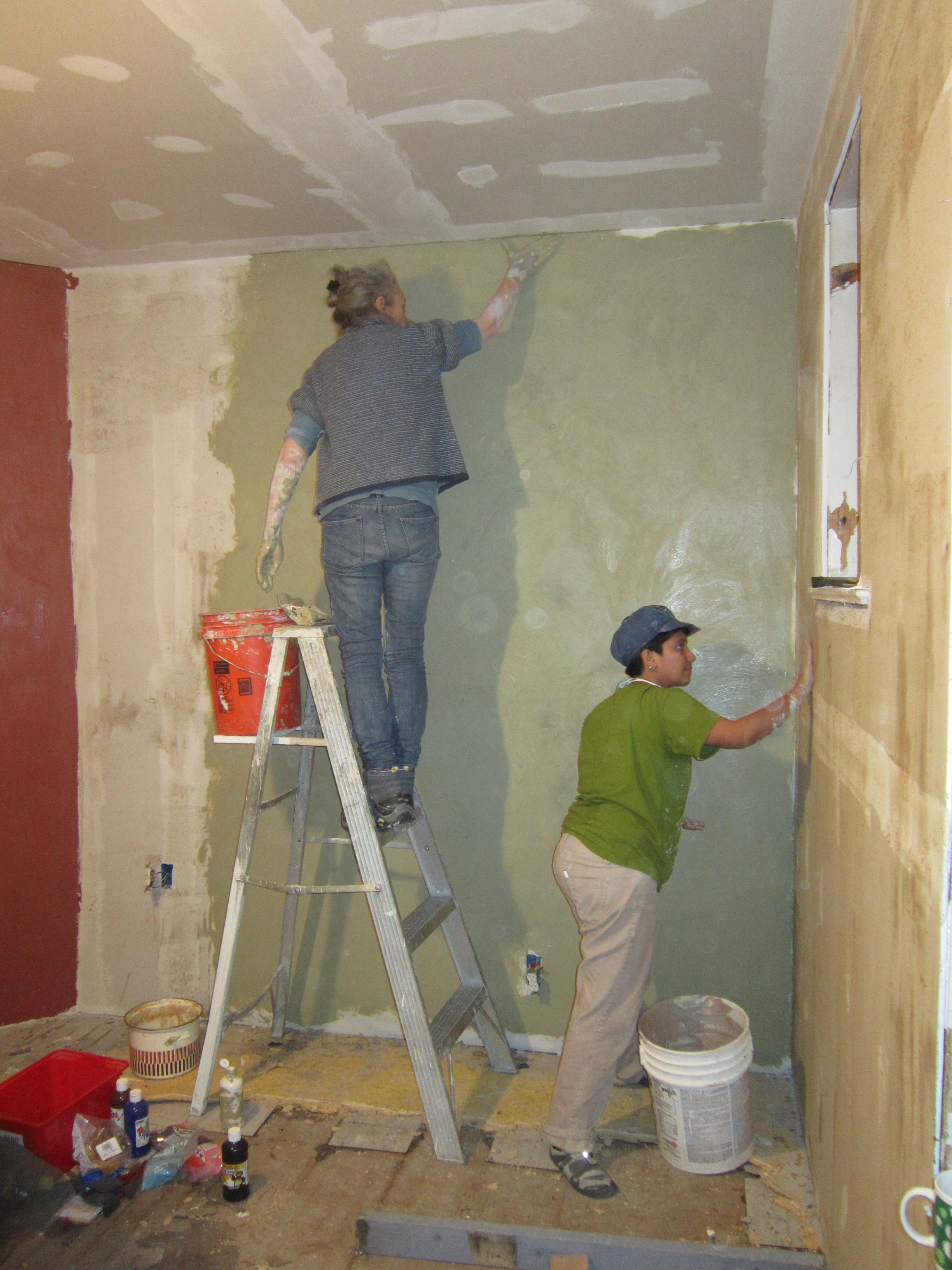 We applied a wheat and water paste (yes, just wheat and water heated for 30 minutes) on the walls before applying the paint to function as a binding agent.