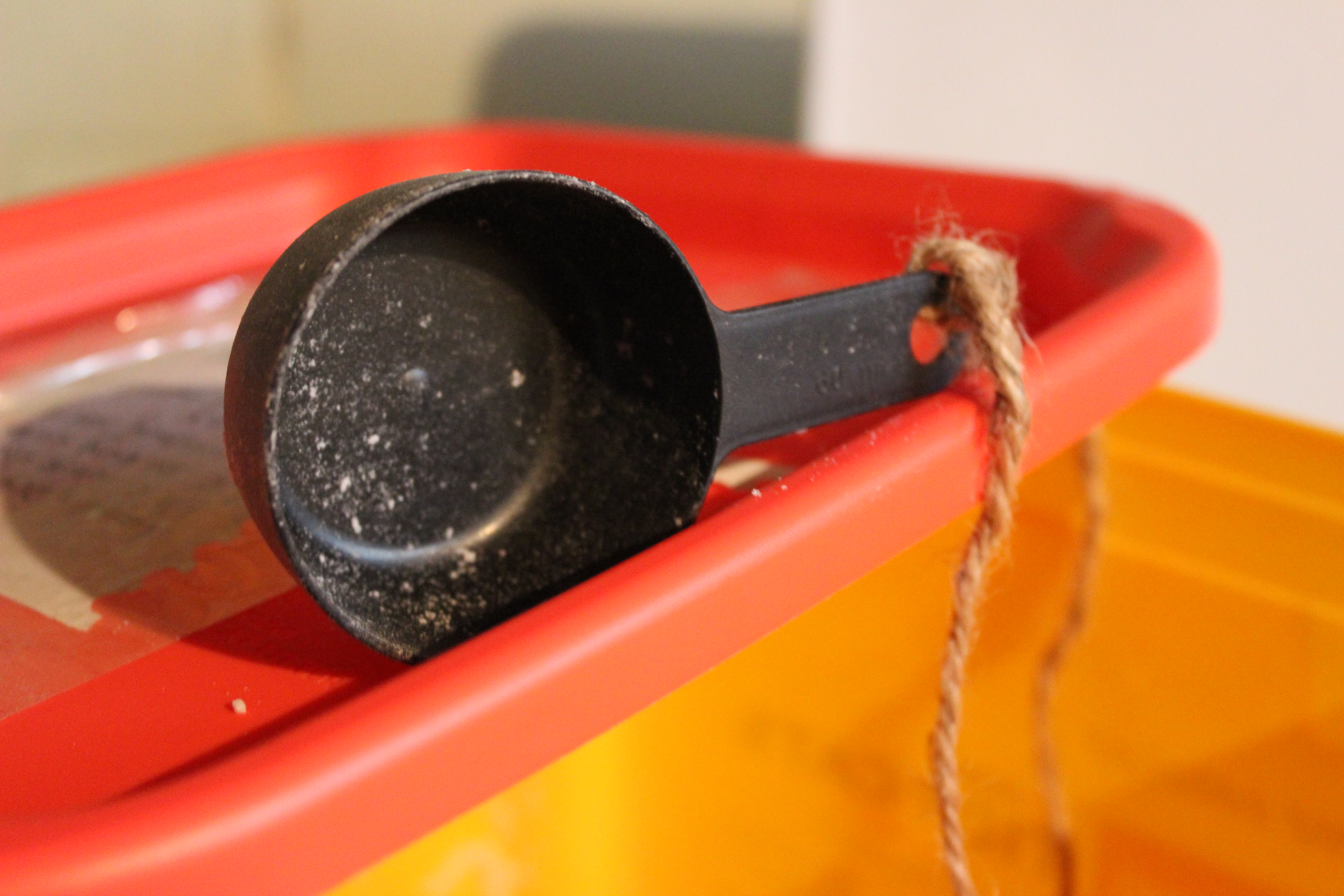An additional tip is to find an old container that can be reused for storing your powder.  I cleaned an old cat litter bucket and attached a 1/4 cup measuring spoon with twine for ours.