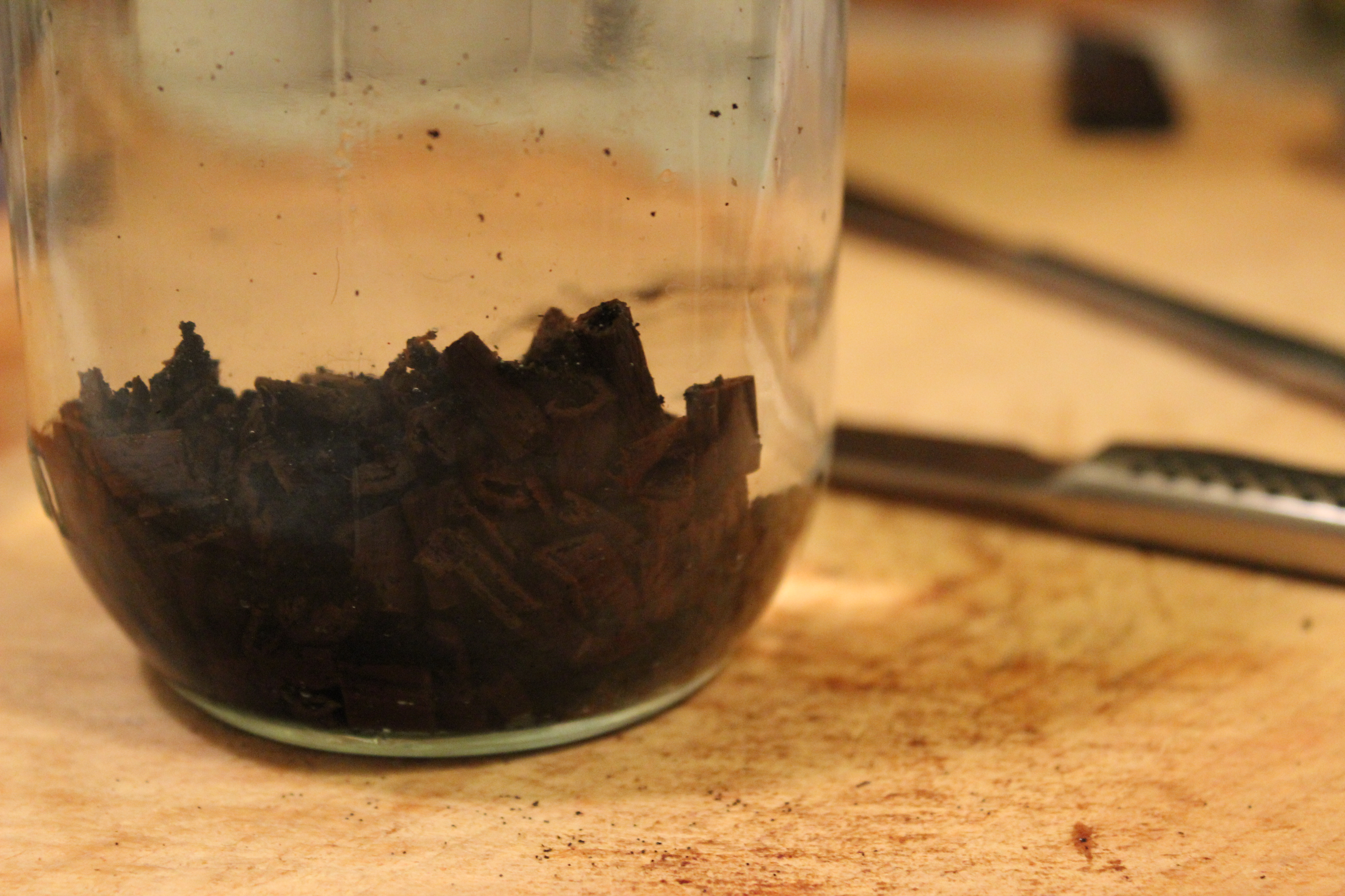 To begin making an extract, I selected 9 vanilla pods. I made an incision along the edge and scraped out many of the seeds found inside. I placed these into a pint canning jar.