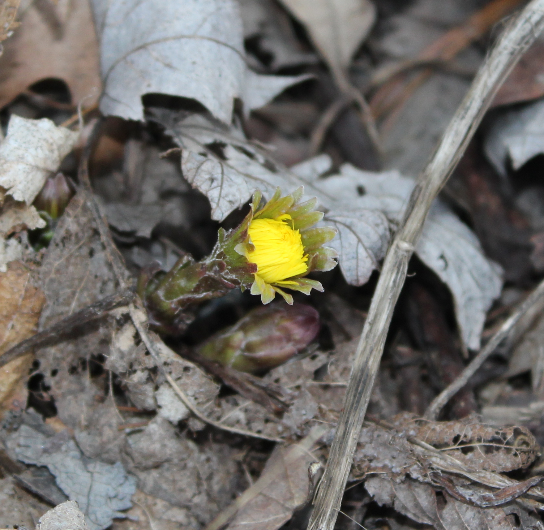 And of course, as usual I’ve been traipsing through the woods to see what I can find.  Coltsfoot is one of the first forest wildflowers.  It’s scientific name is Tussilago farfara and it has historically been used to relieve coughs.  This photo is of one just before it opened fully.  I’ve since spotted patches in full bloom. Spring is definitely here!