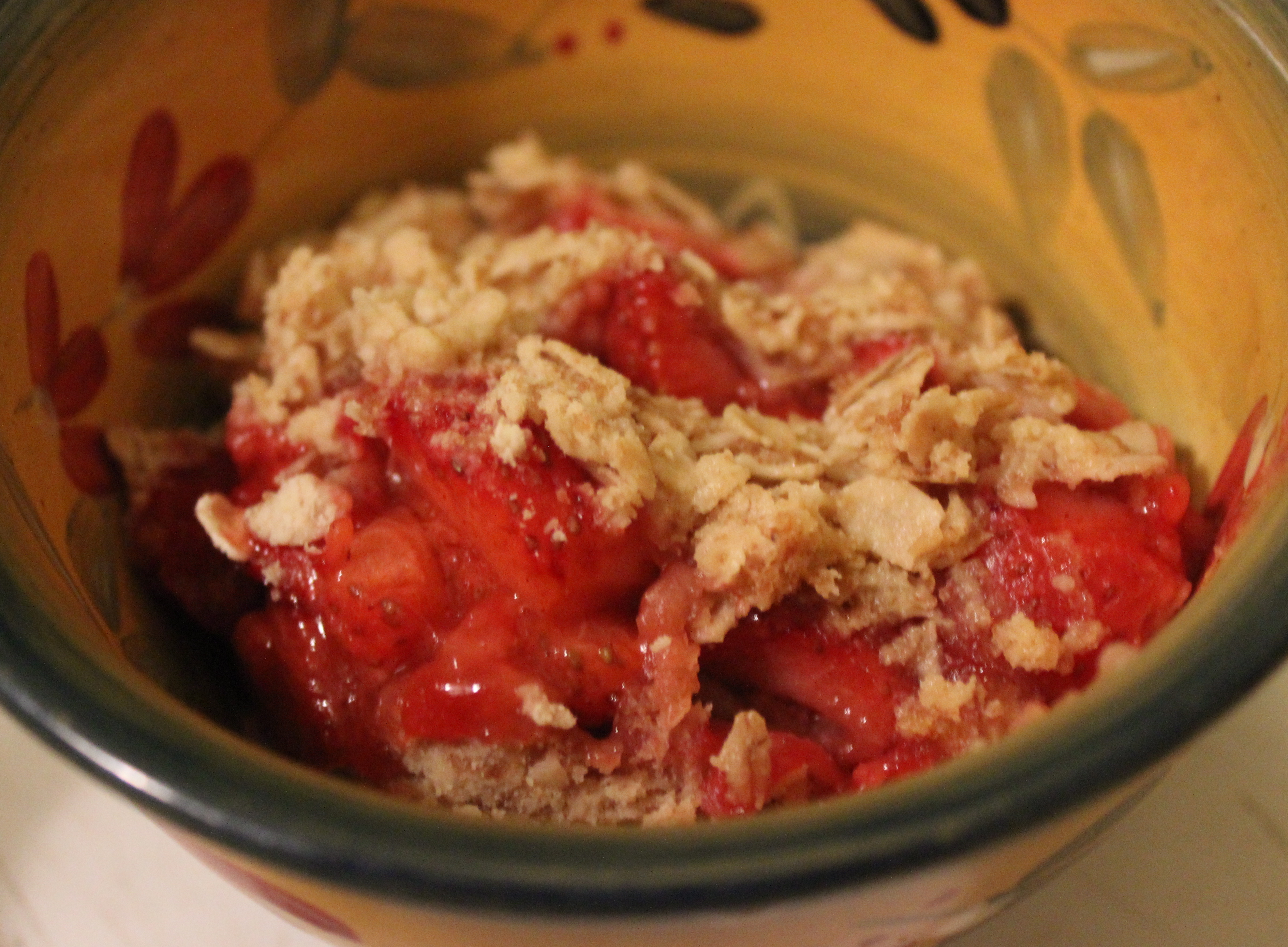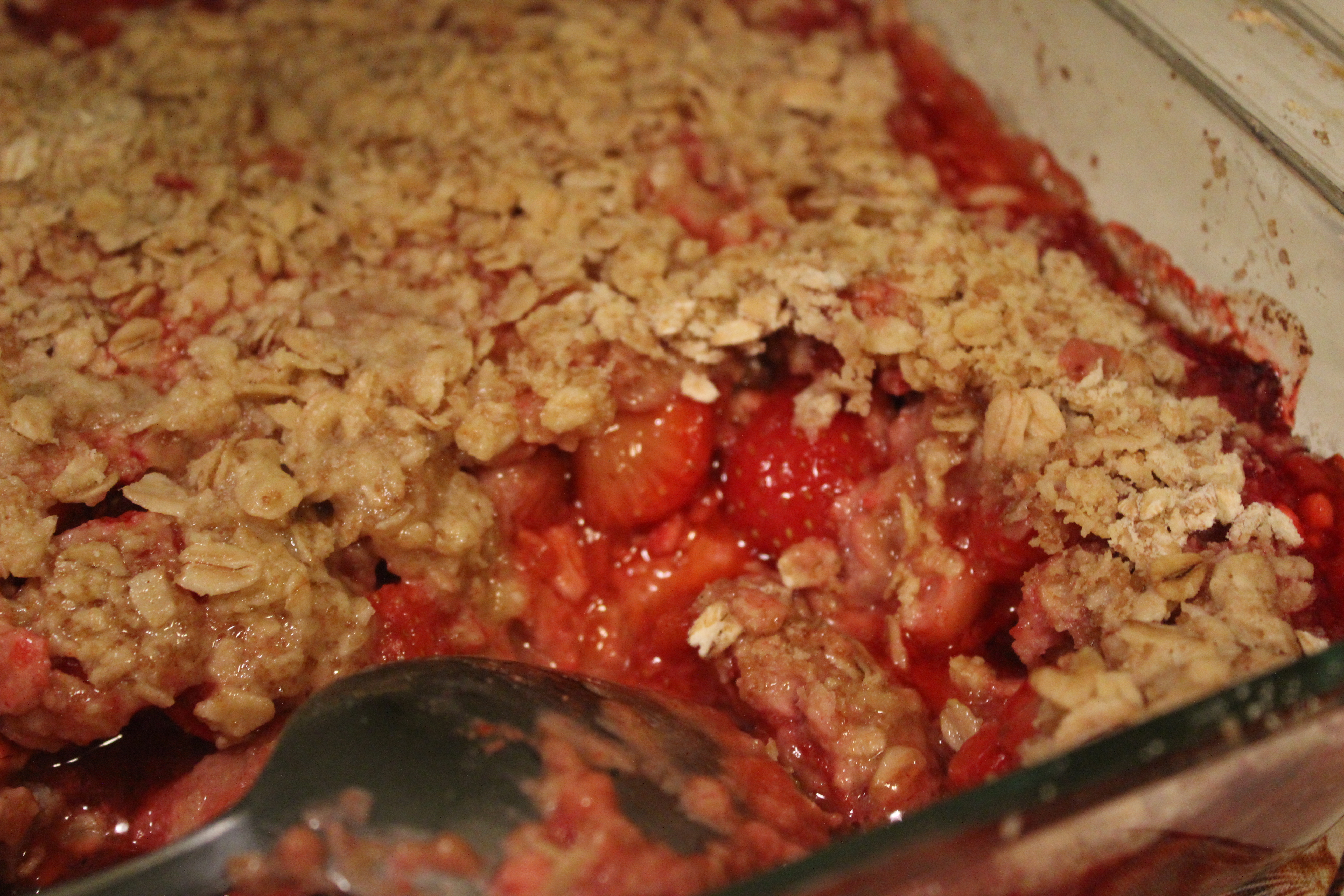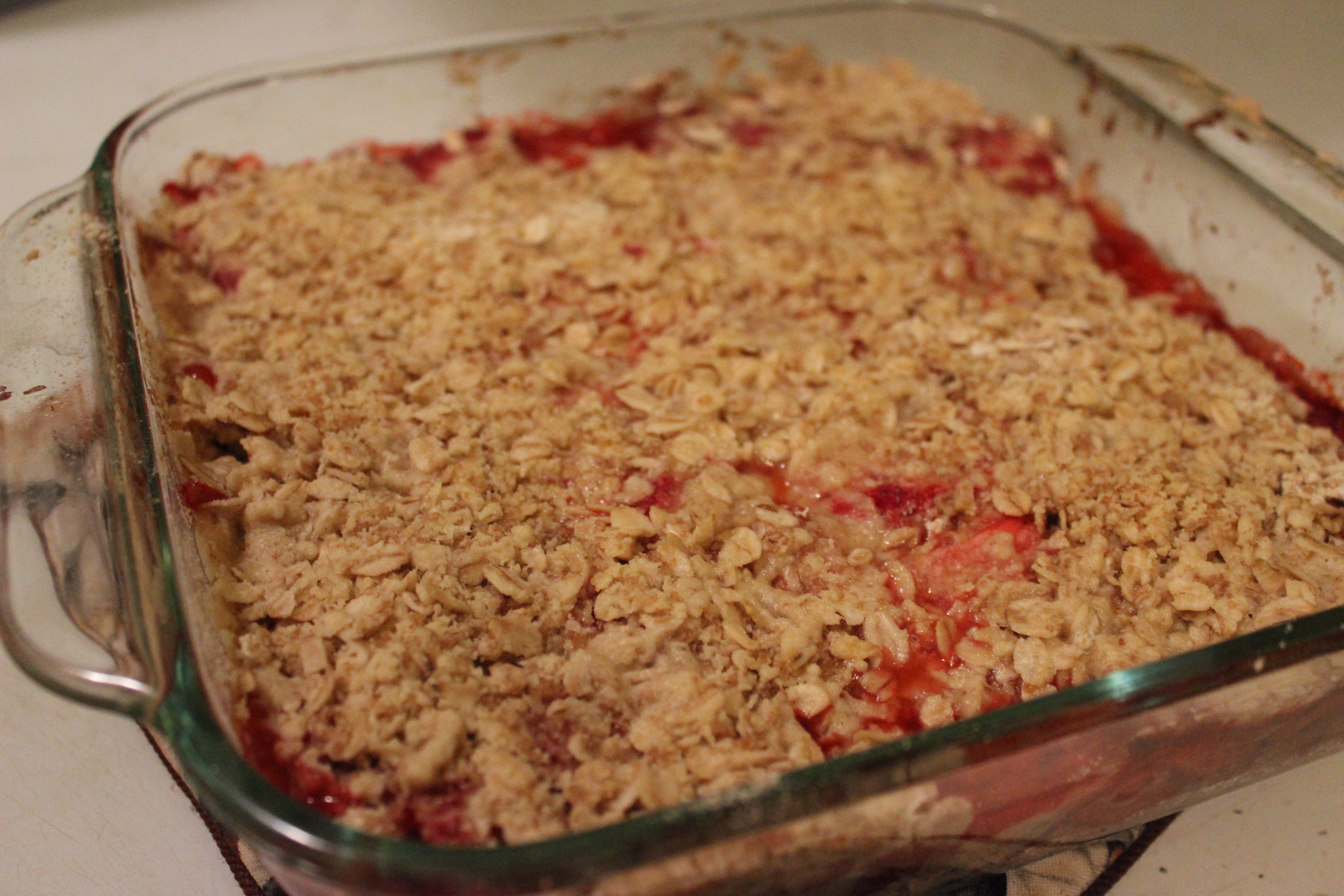 Reserve 1 and 1/2 cups of the crumbly mixture to use as topping, while patting the remainder into a 9×9 baking dish. Layer the strawberries on top of this crust and sprinkle the reserved crumbles on top.