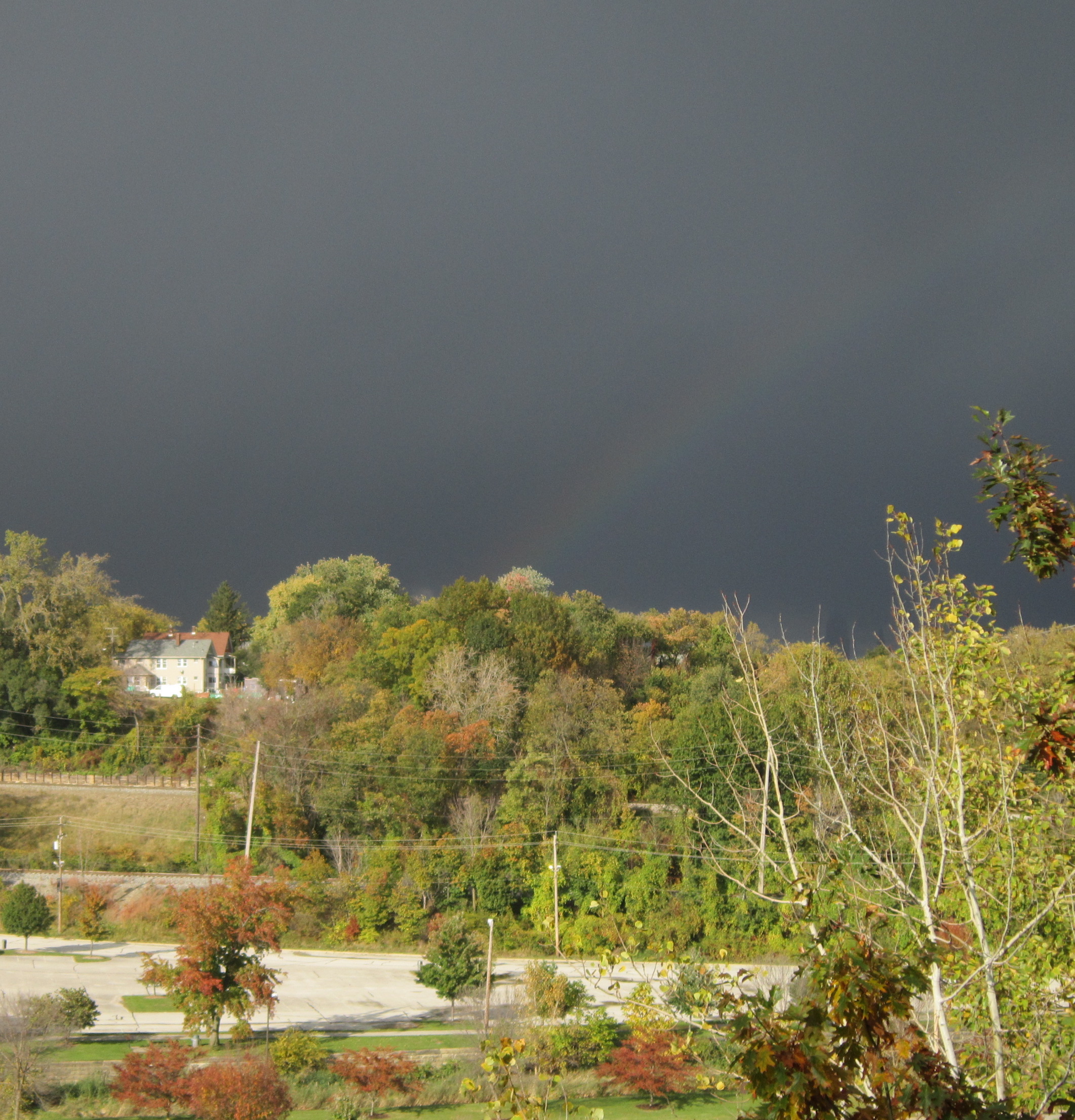 We’ve had some strange days of weather recently. This photo isn’t the best, but in it you can see a rainbow, really dark clouds to the North over the lake, and you can tell that it is 100% sunny behind me by the way the trees are shining with light. Add to that some lightning and snow all in the same day and you can see what I mean – strange! But kind of beautiful, really…