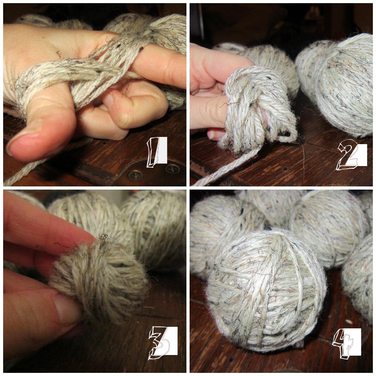 4. Tuck the tail of your yarn under several other strands to form a ball.  Four is a good amount to make.