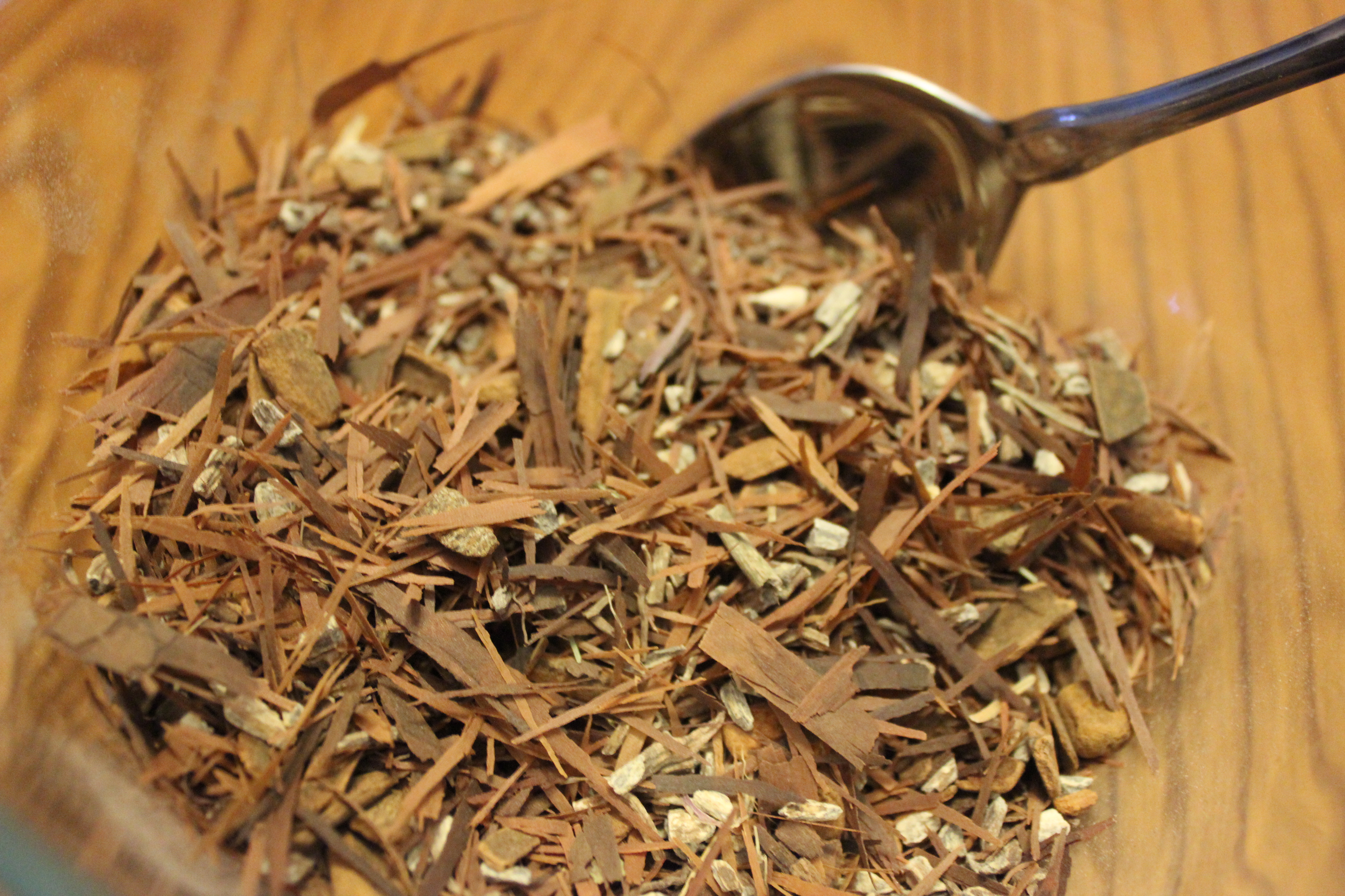 This tea is composed of three ingredients: echinacea (Echinacea spp.), pau d’arco (Tabebuia spp.), and an herb to flavor the blend (cinnamon, orange peel, licorice root, etc.). I like to use cinnamon — yum!
