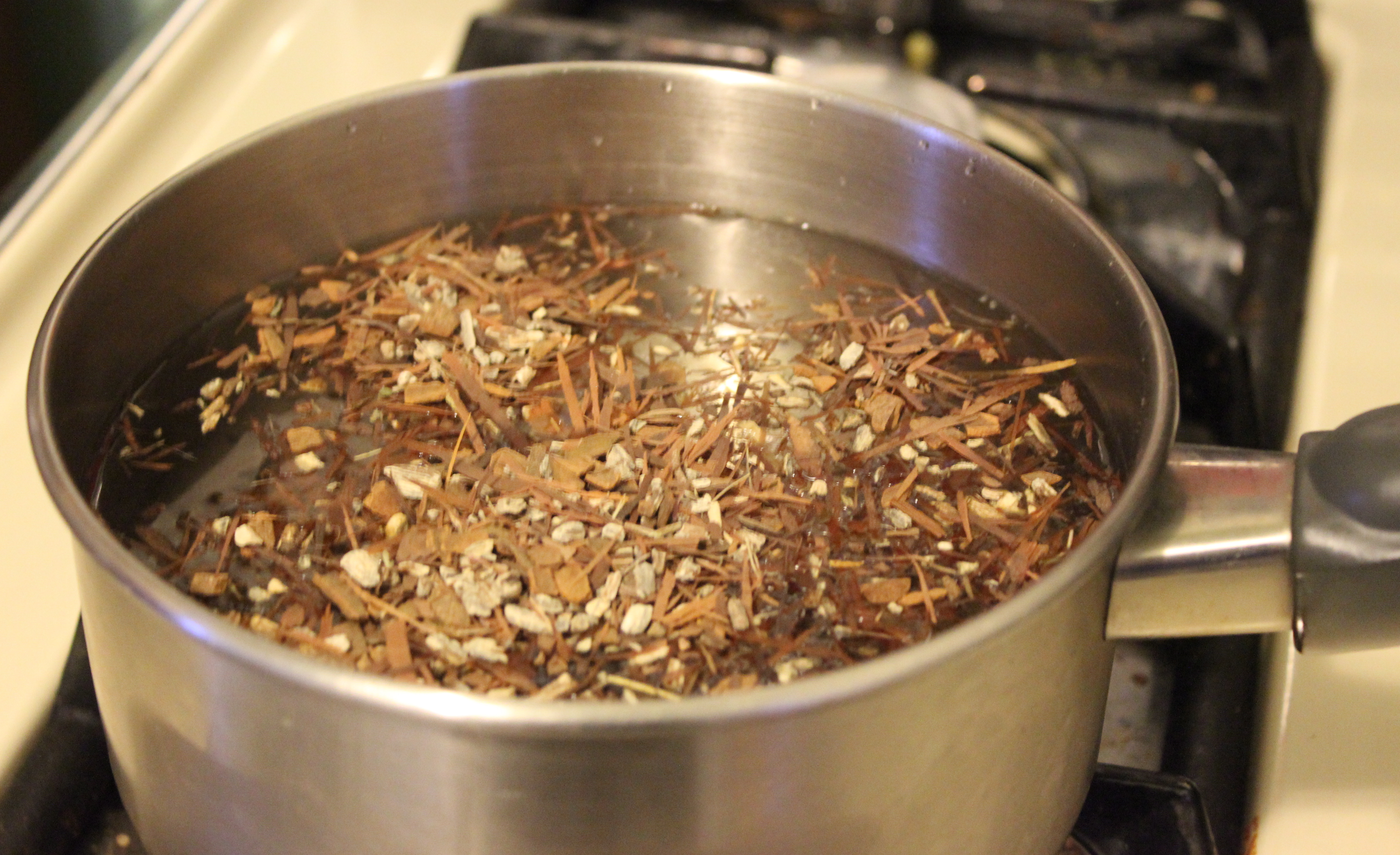 IMG_9143To make the tea (which is actually a decoction), add four to six tablespoons of the herbs to a quart of cold water and bring to a boil.