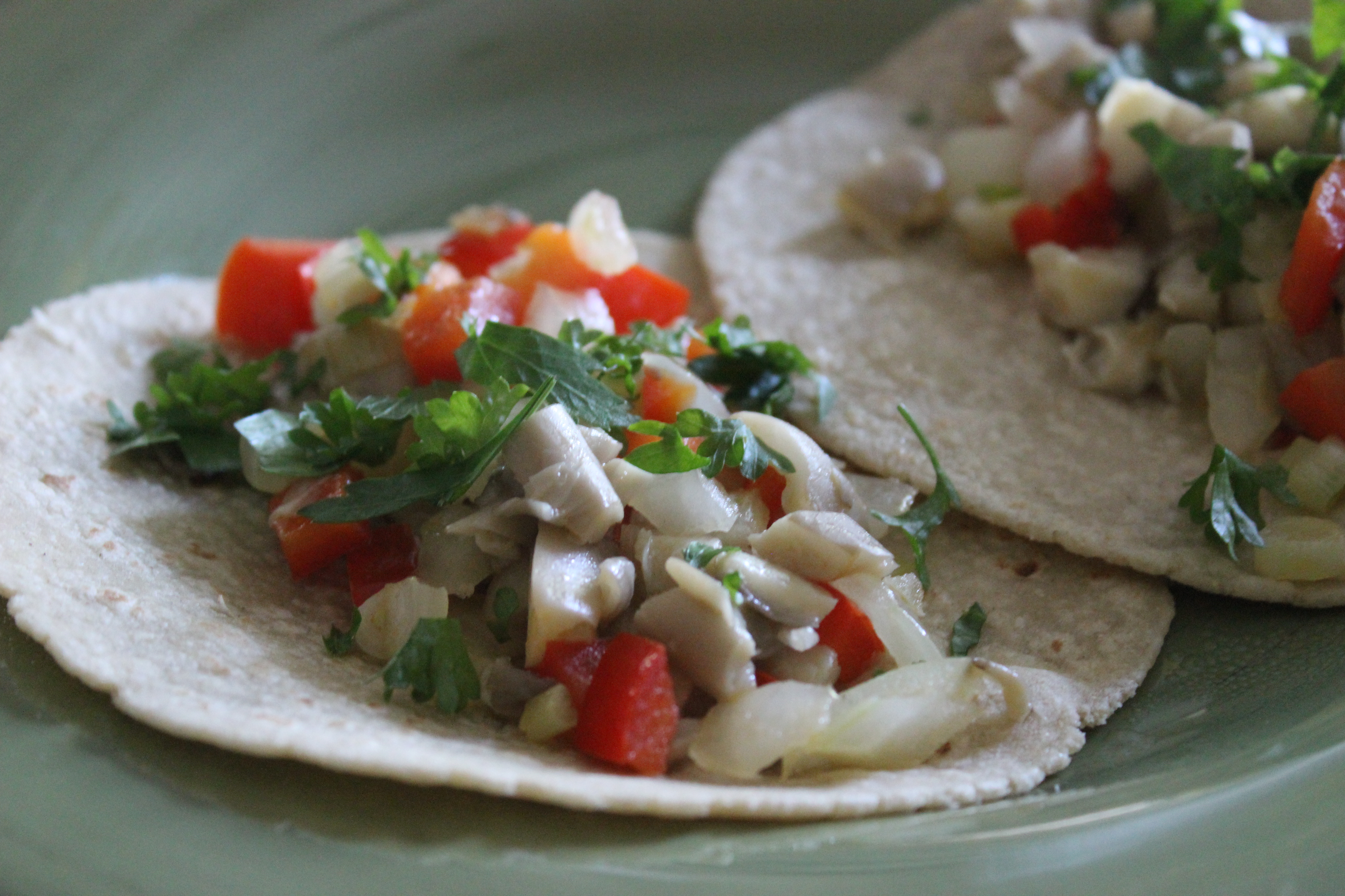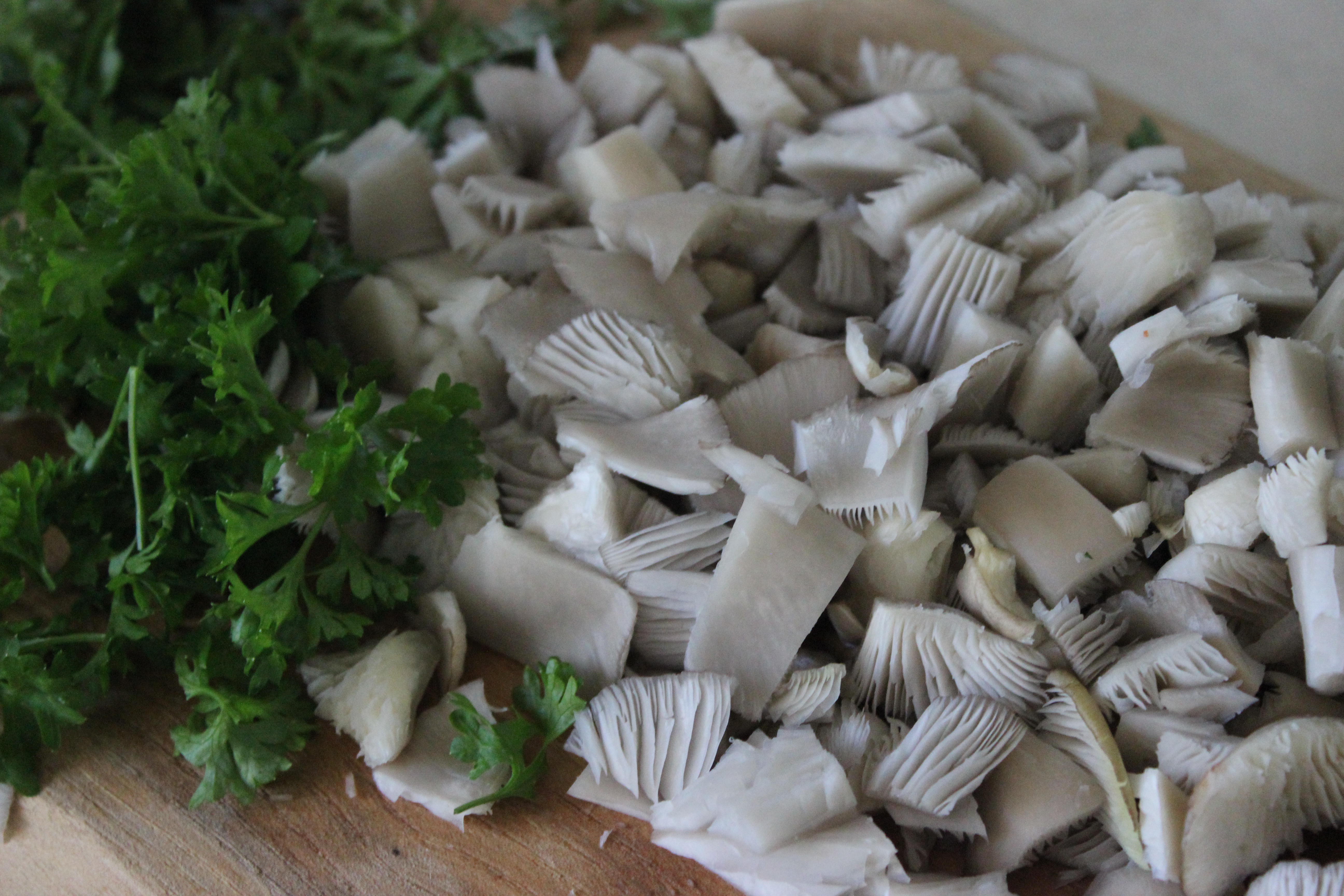 Growing these mushrooms was incredibly easy – I cut a hole and soaked the bag holding the spores for 8 hours, and then I gave them just a little water each day.  Within a day or so, I noticed the little bulbous beginnings of the mushrooms and then they grew immensely each day thereafter. Finally, they looked like the right size to eat and so I decided that it was oyster mushroom taco day!