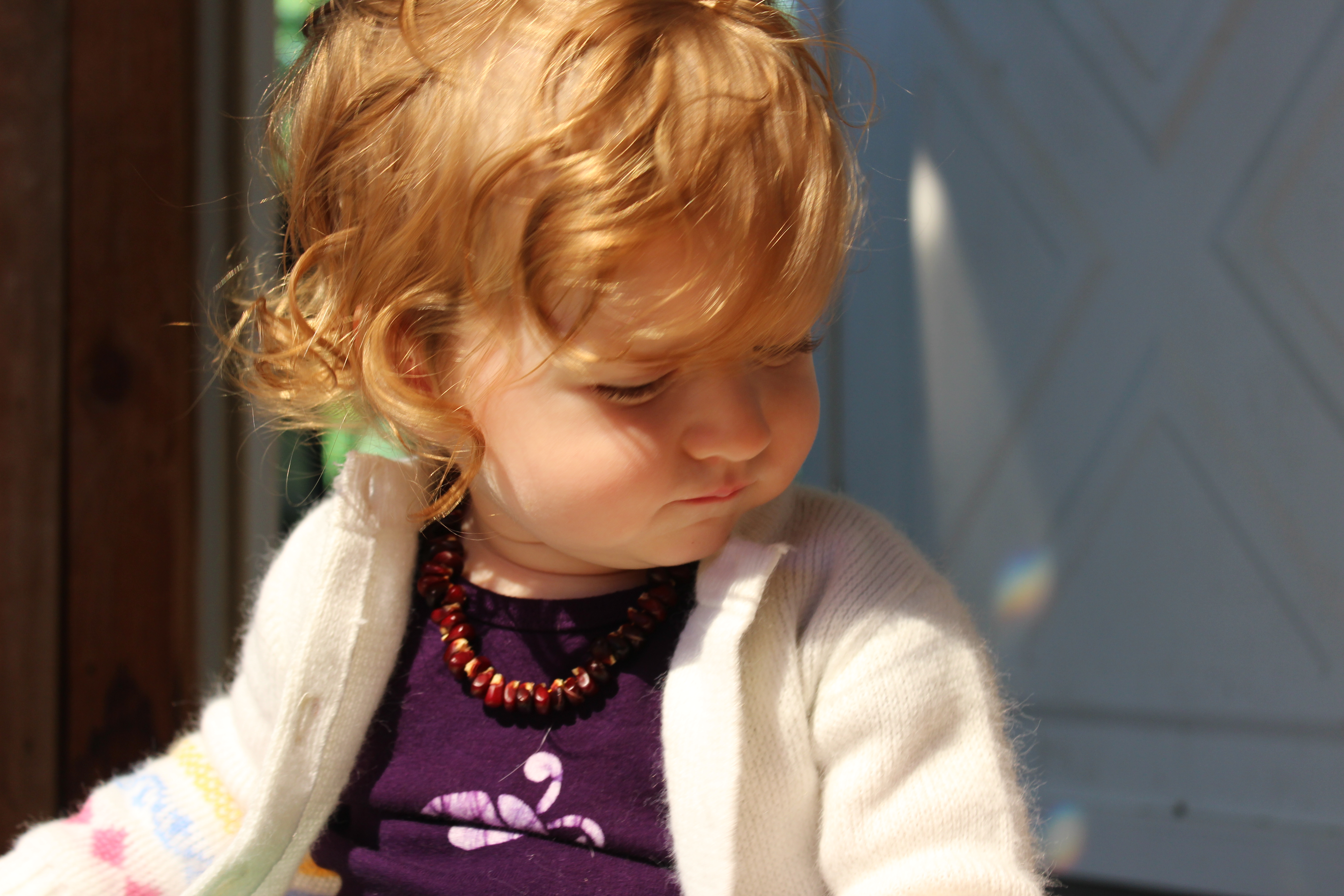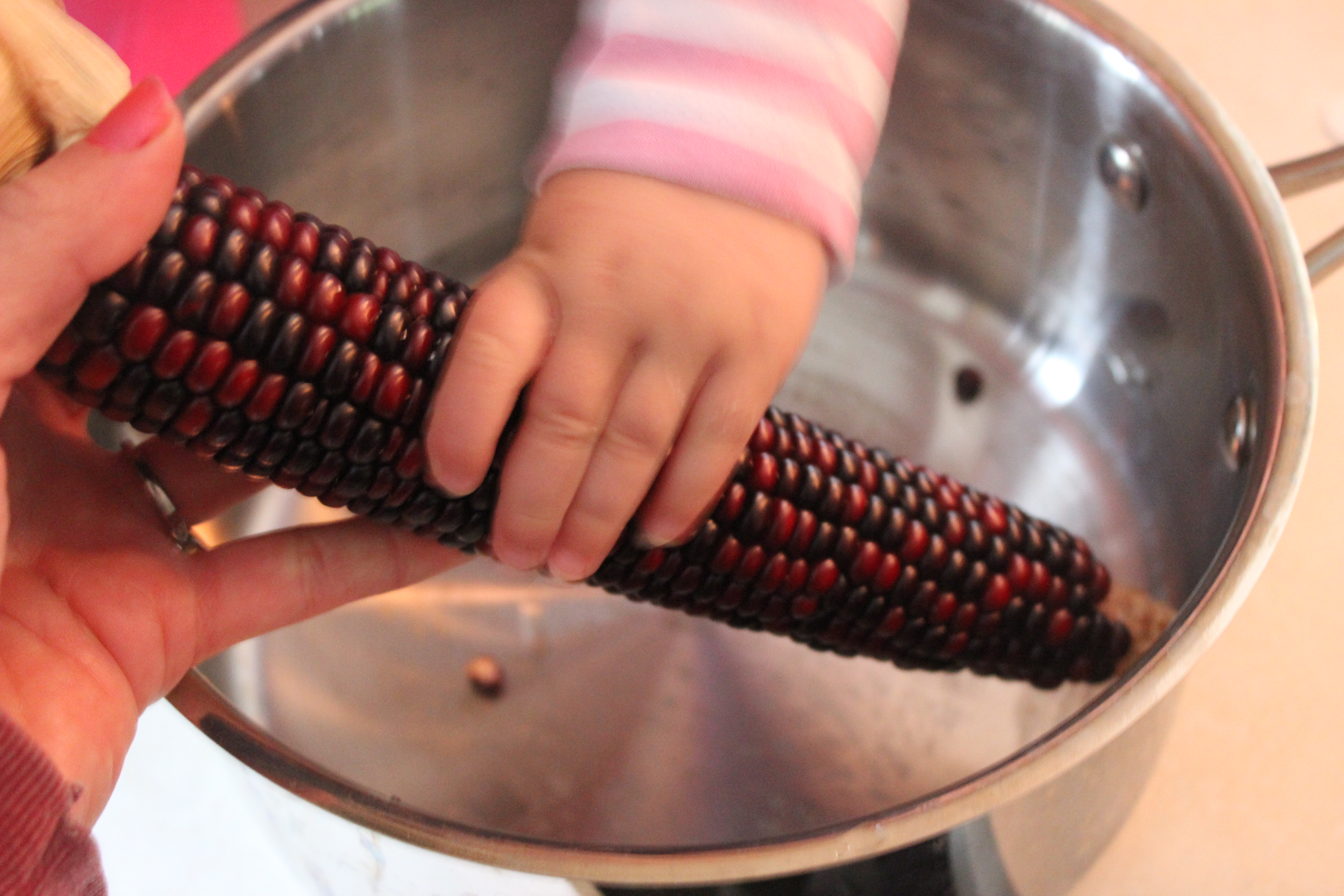 It’s a little challenging to start popping off the kernels, but using a twisting motion on the ear will start the process. Eventually, they start to come off easier and then you need to remind the baby (repeatedly) that these are not kernels for eating.