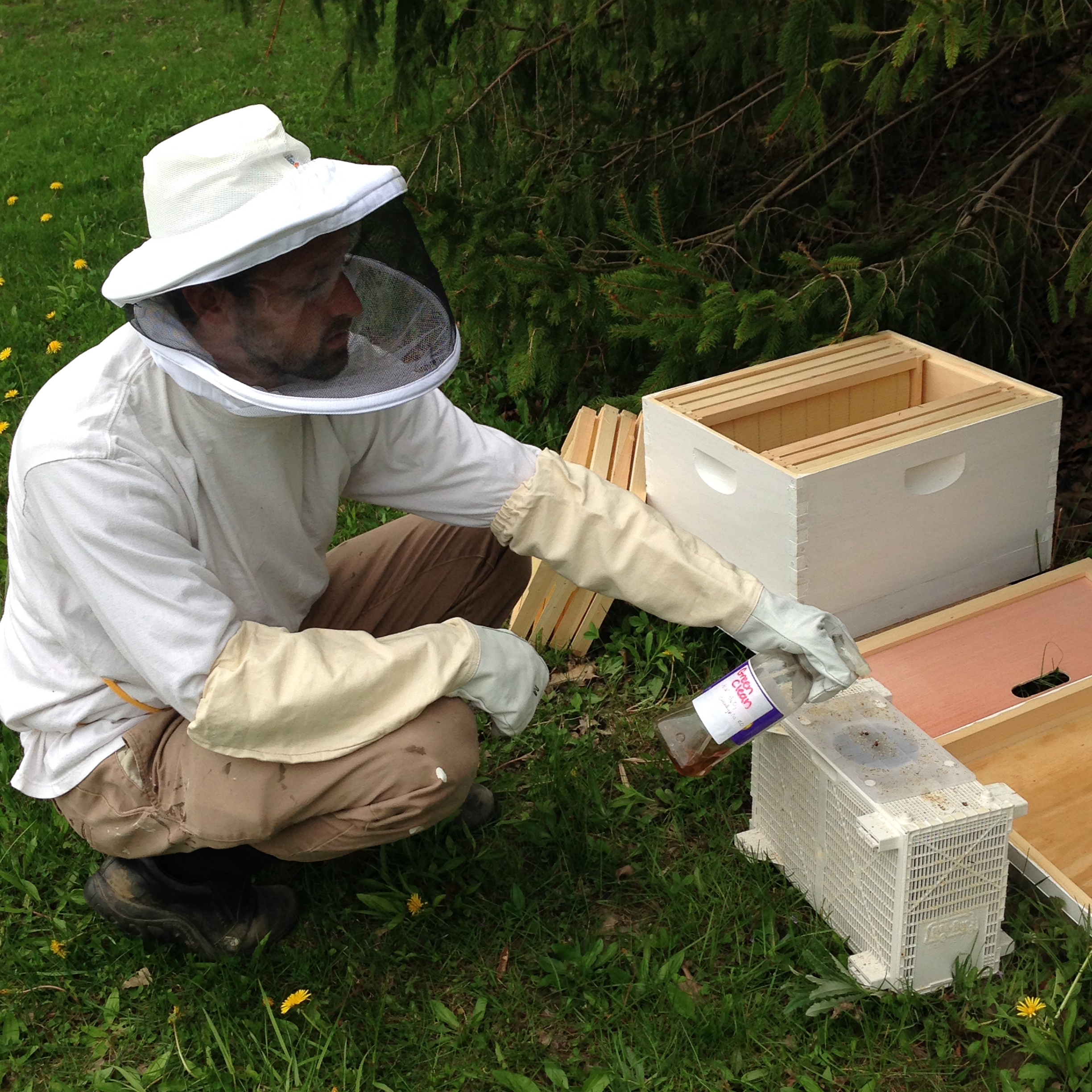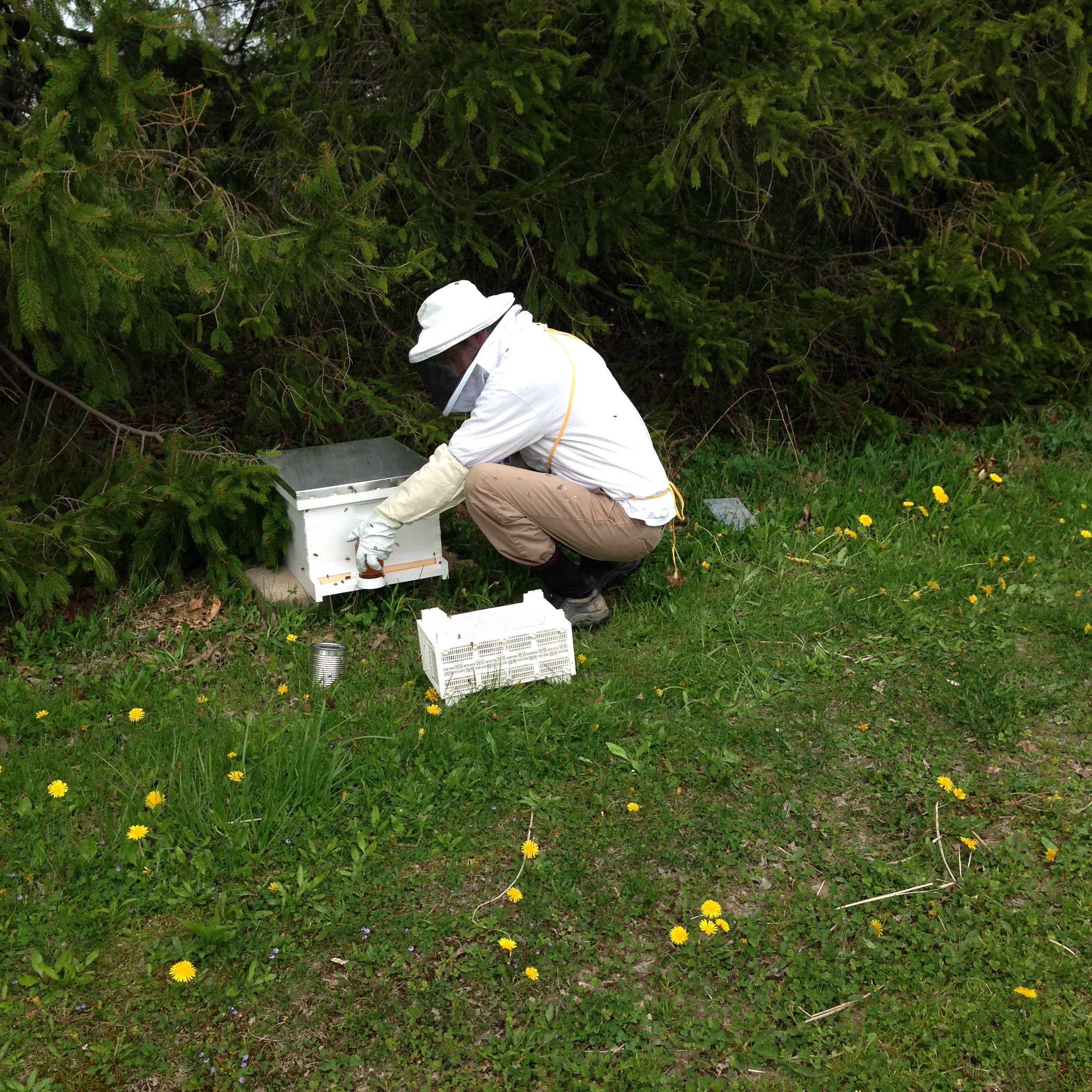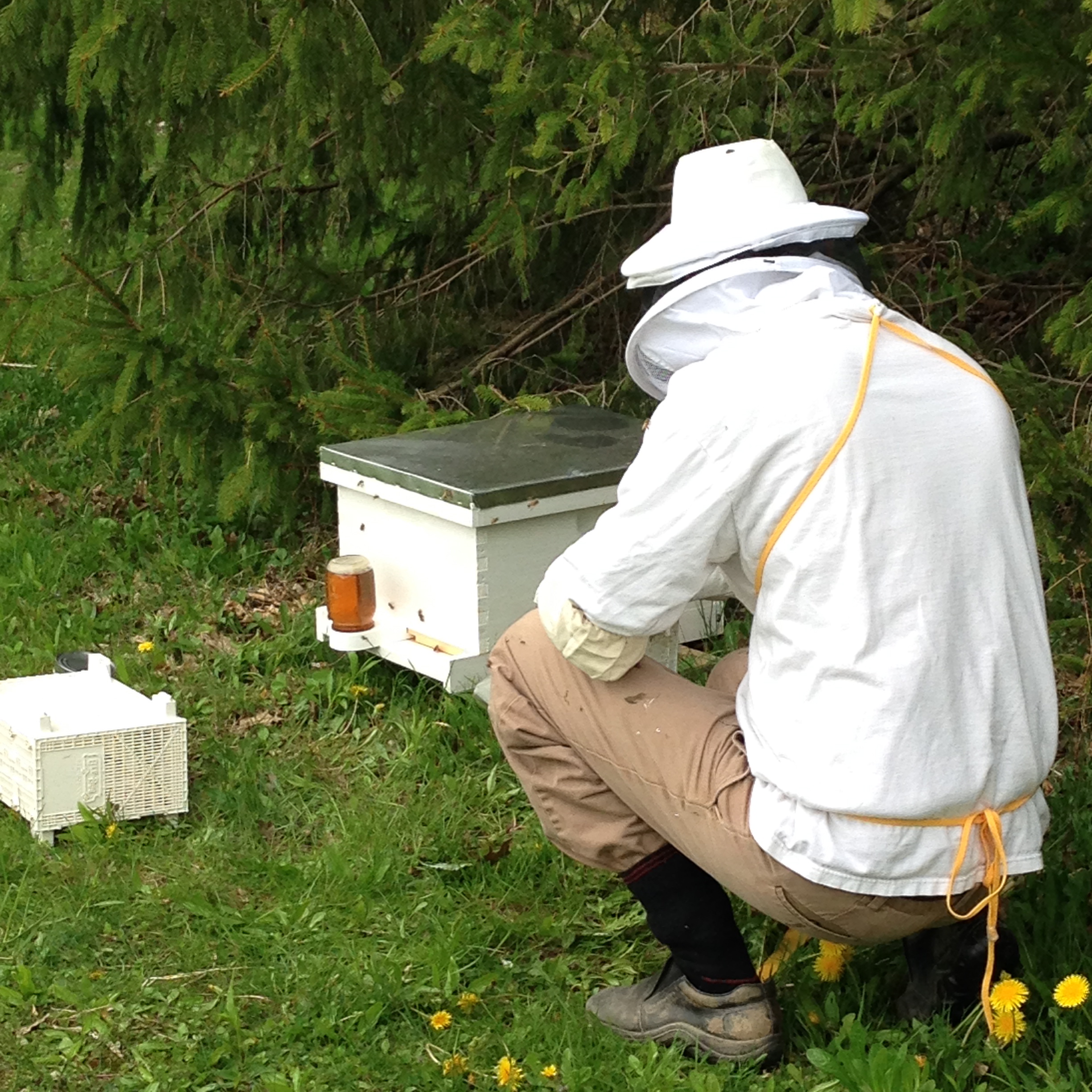 He placed a sugar water feeder at the front of the hive. This will only be in place for three days as the bees adjust to their new home and learn to forage on our land.