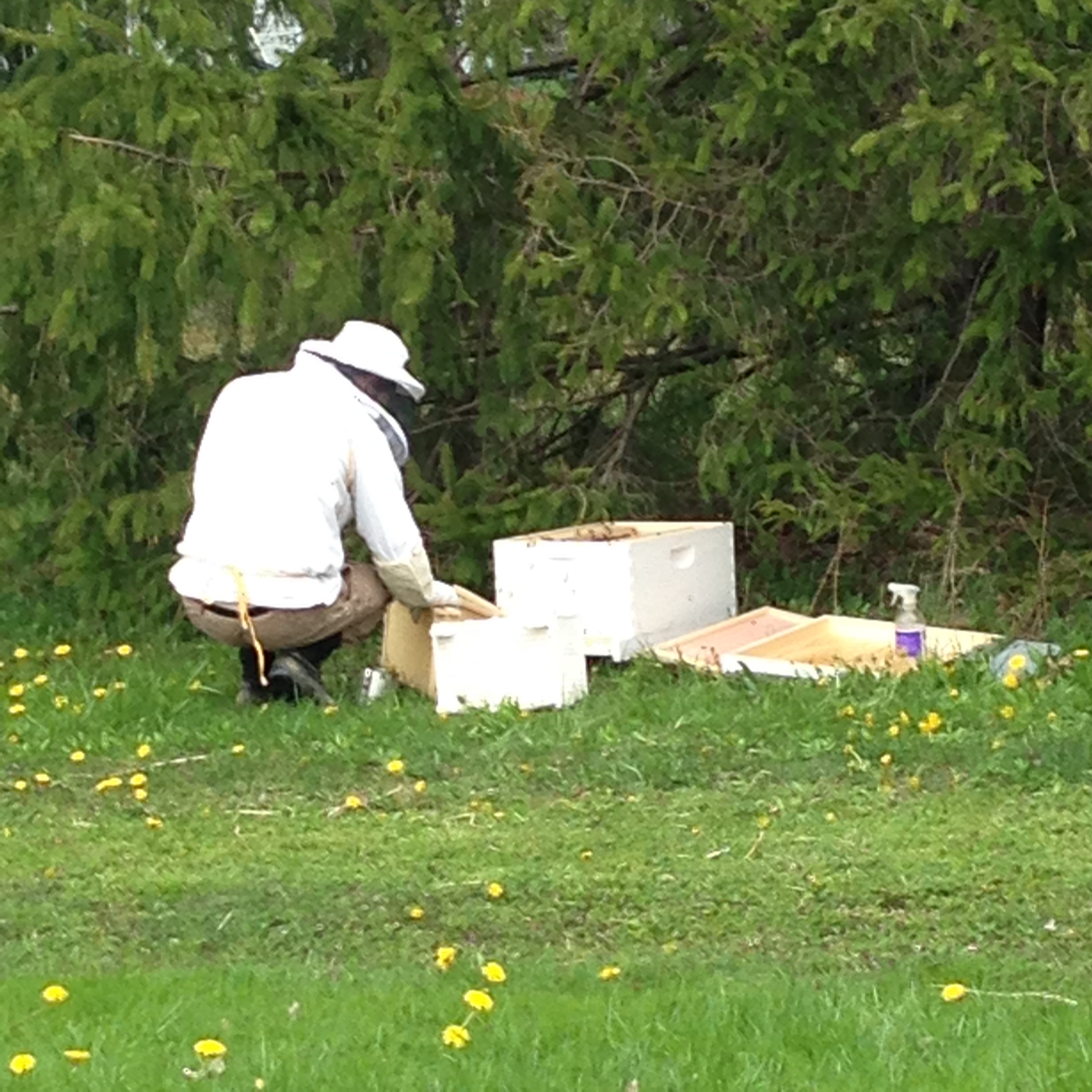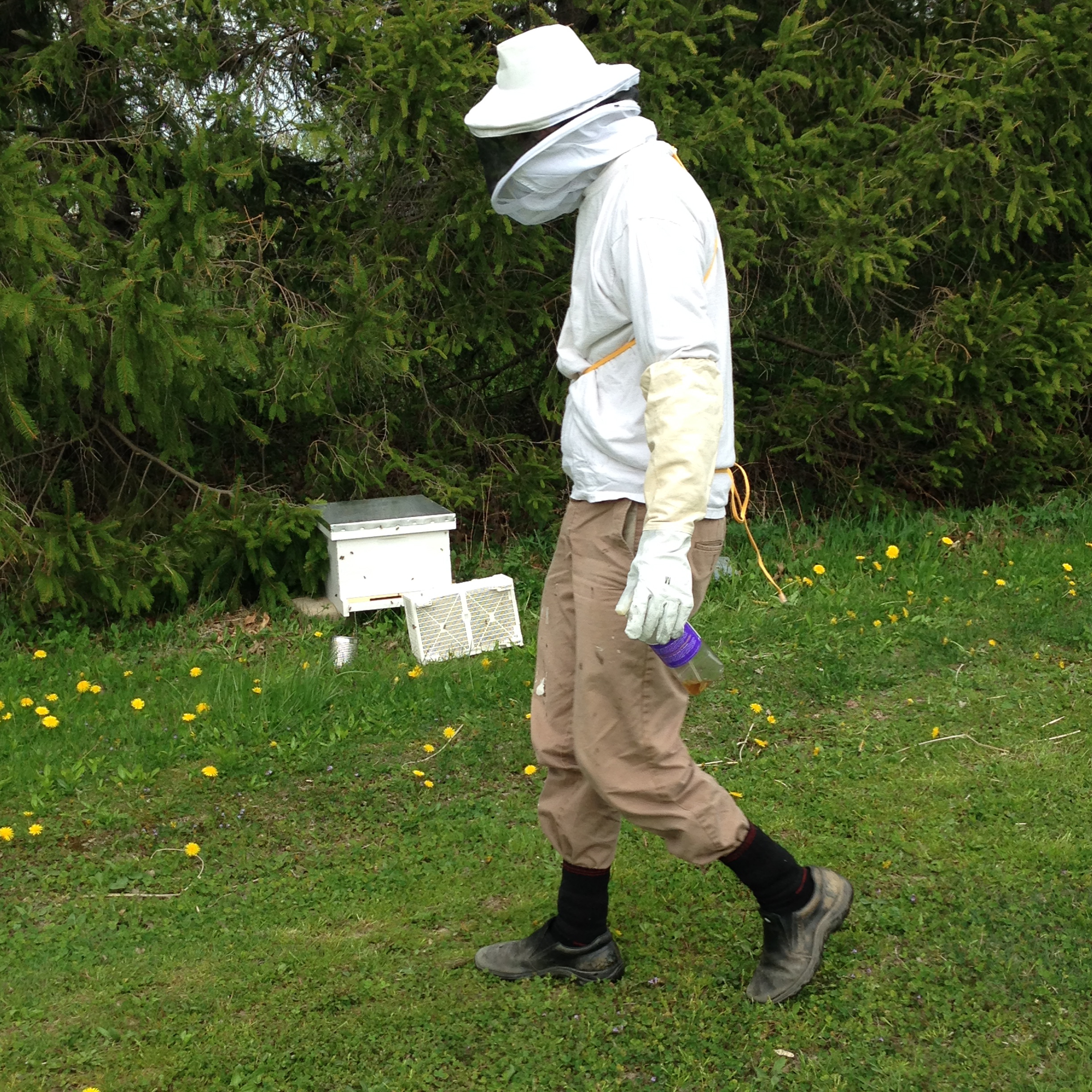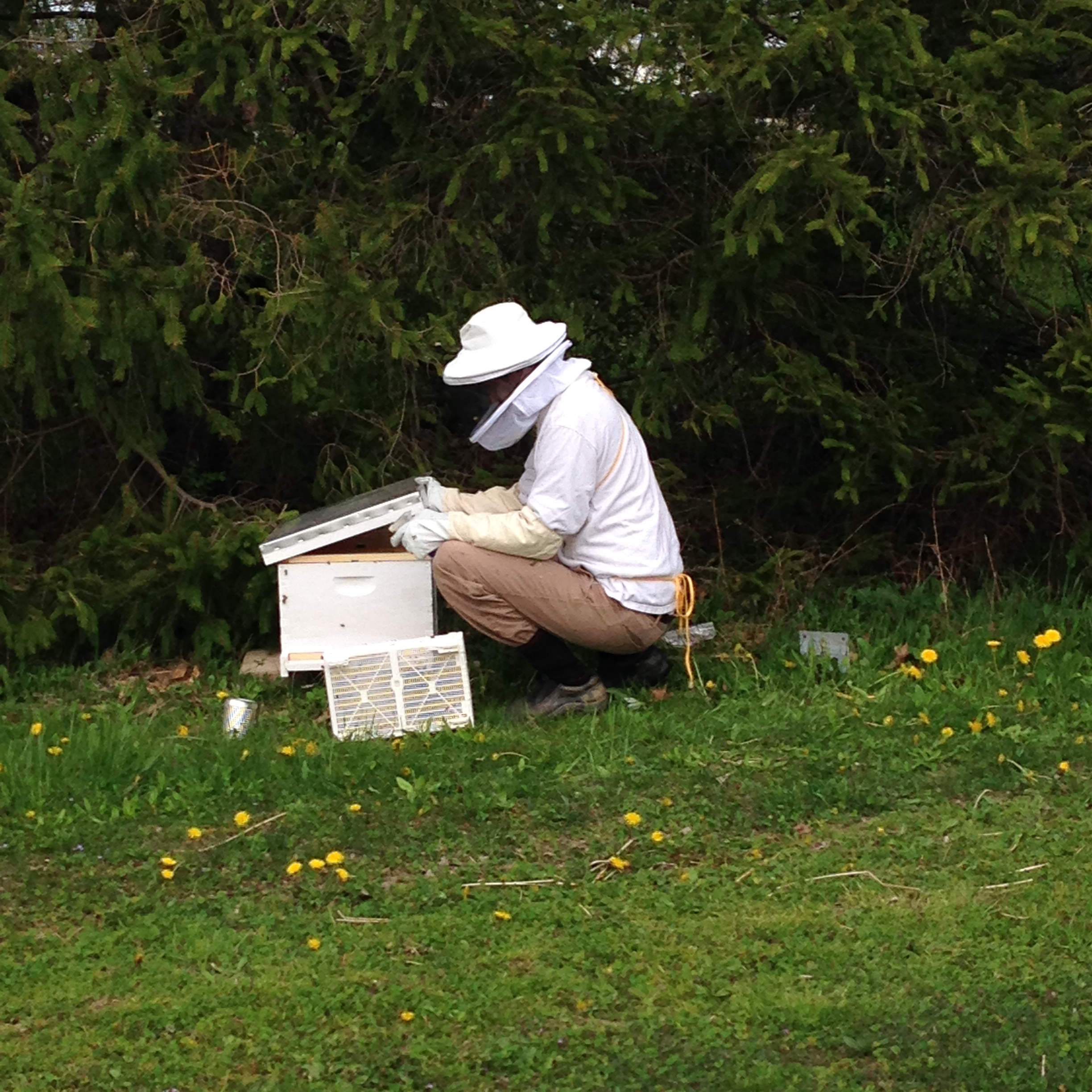 He placed a sugar water feeder at the front of the hive. This will only be in place for three days as the bees adjust to their new home and learn to forage on our land.