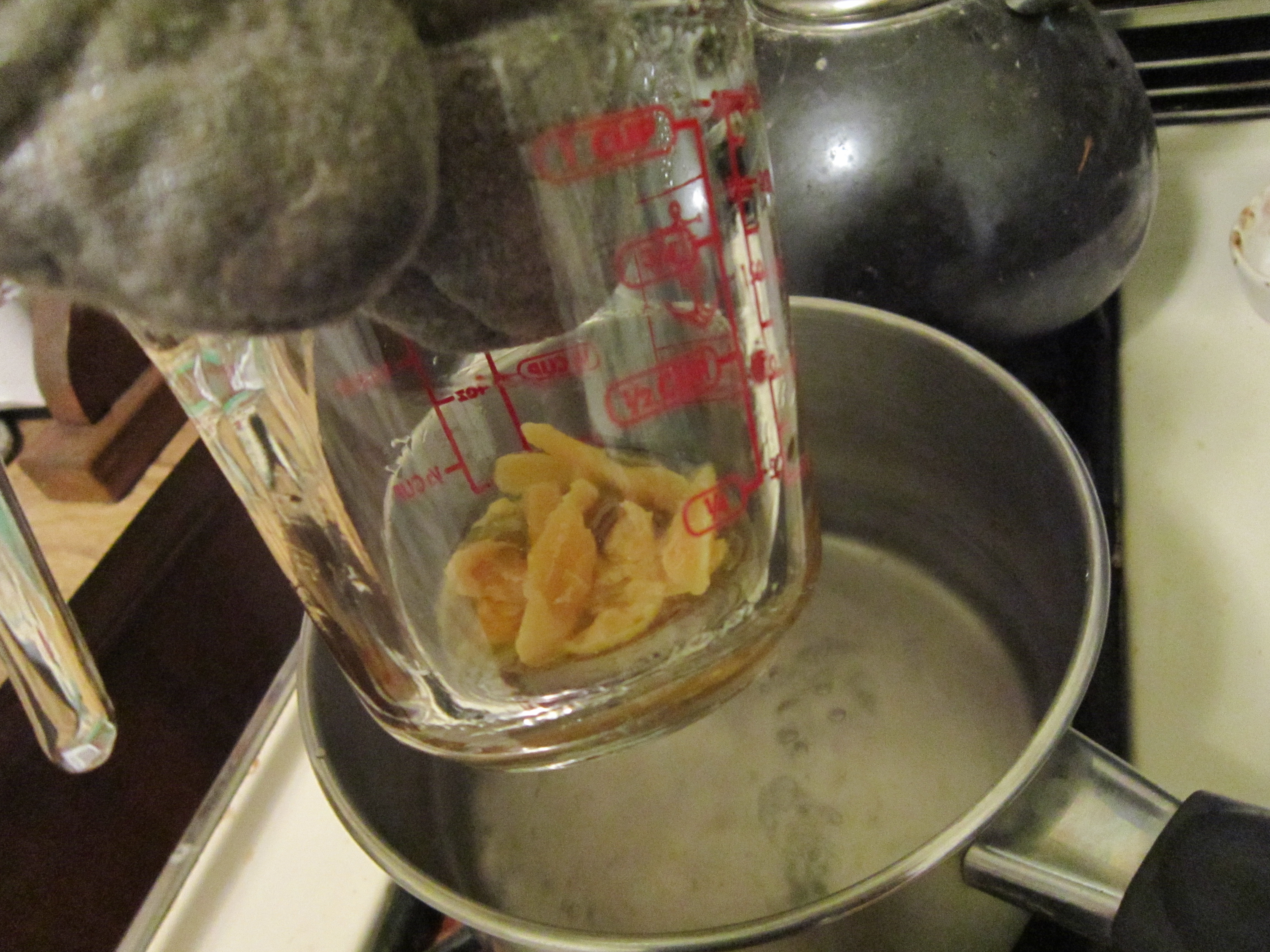 Add 2 Tablespoons of beeswax (I just guessed at the amount when I made this…) to the measuring cup and let melt.