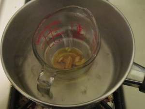 To make a salve, create an easy double boiler by putting a measuring cup into a pot of boiling water.