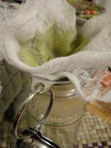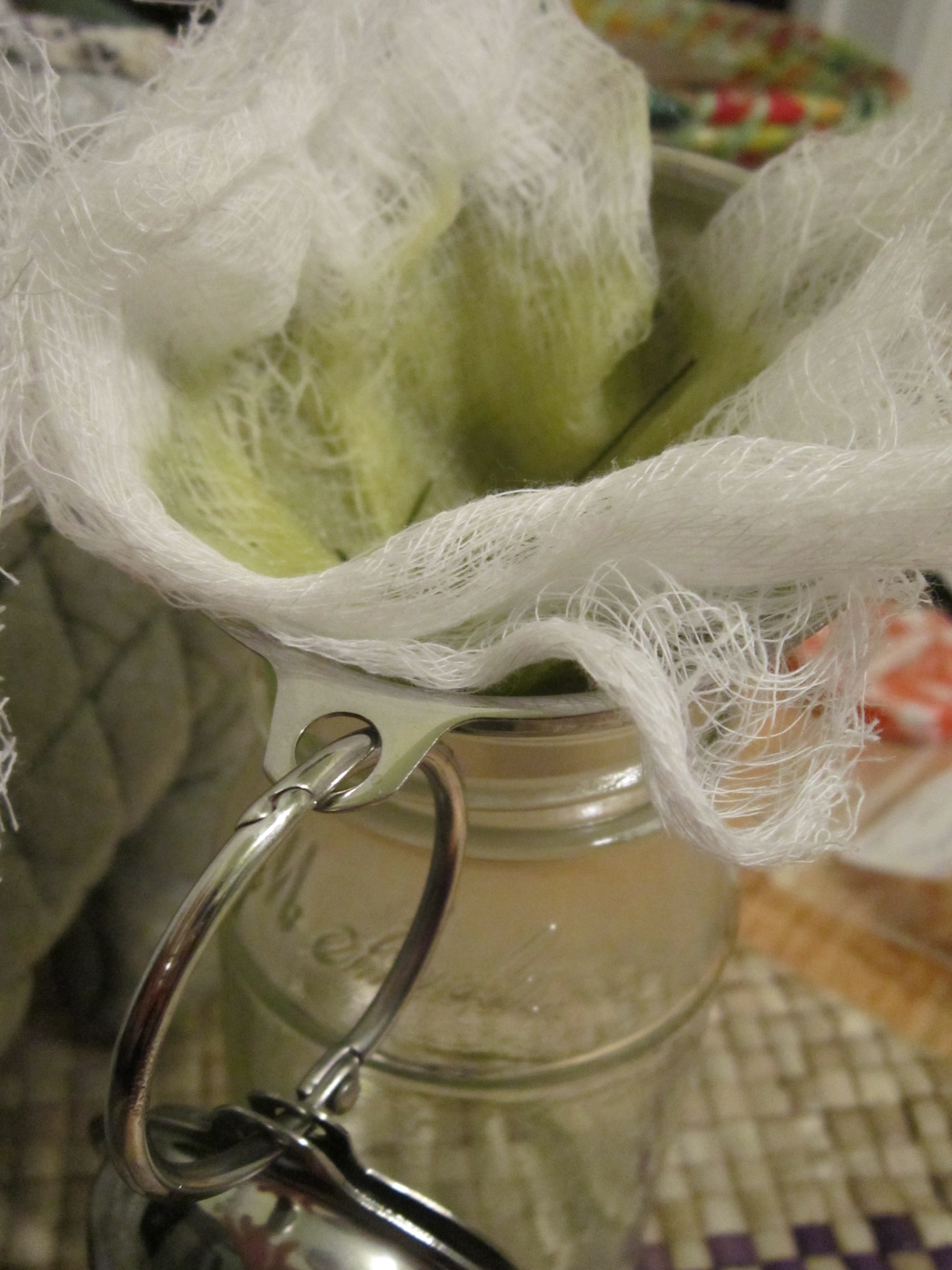 And then cover with the menstrum. In this case, it’s apple cider vinegar.  I get large jugs of the raw kind so I boiled some first to ‘pasteurize’ it before making this vinegar (and I was able to boil enough extra for future use). Make sure to completely cover the needles — poke them down so that they’re an inch below the liquid line.
