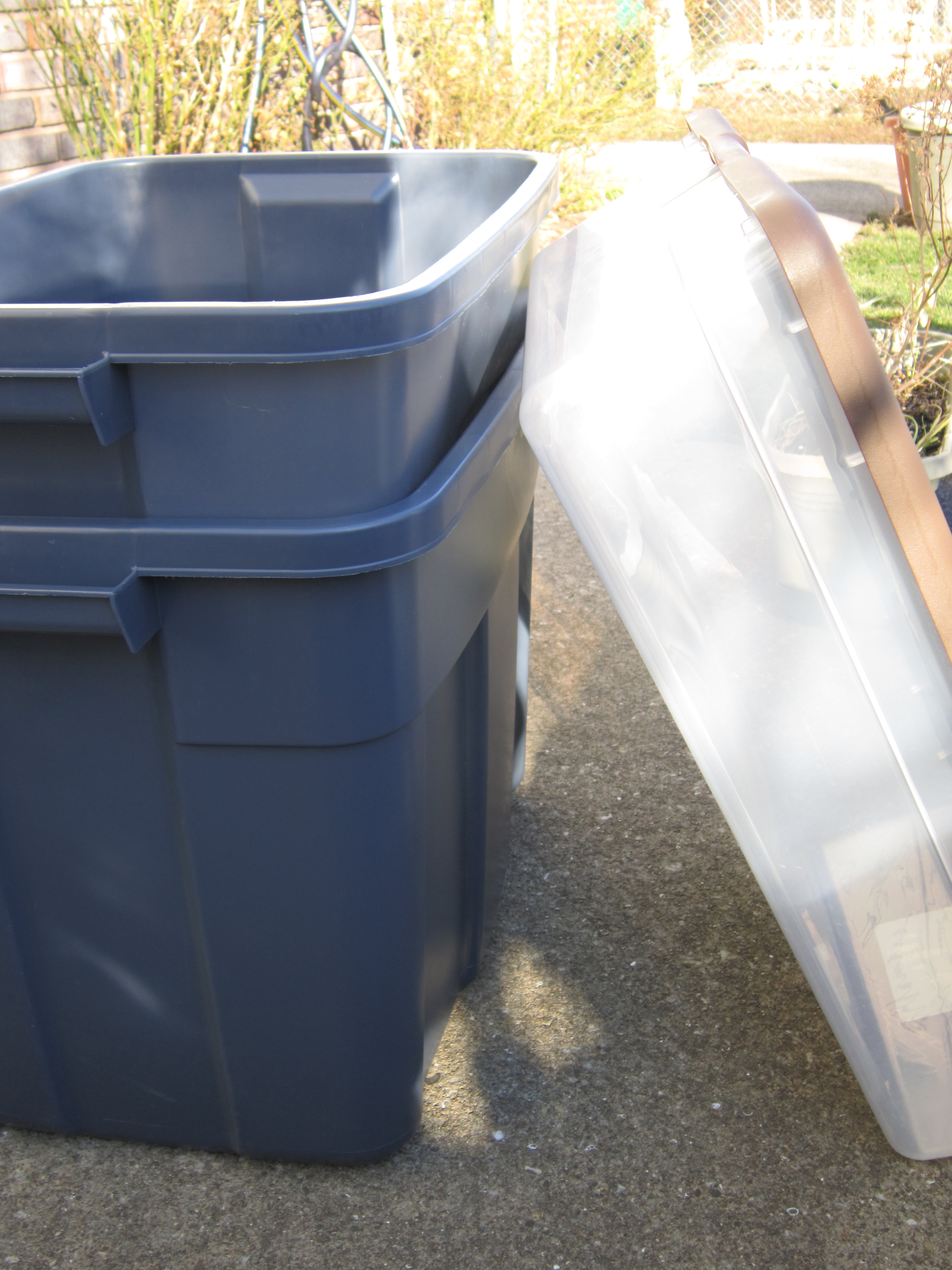 - I acquired three bins — two large 10 gallon bins that fit inside one another (and a lid) and a smaller see-through bin (with a lid). The general idea is that the two large bins are going to be stacked and rotated with the worms and composting material while the see-through bin always remains on the bottom and is just to catch any “worm tea” that drains out during the composting process.