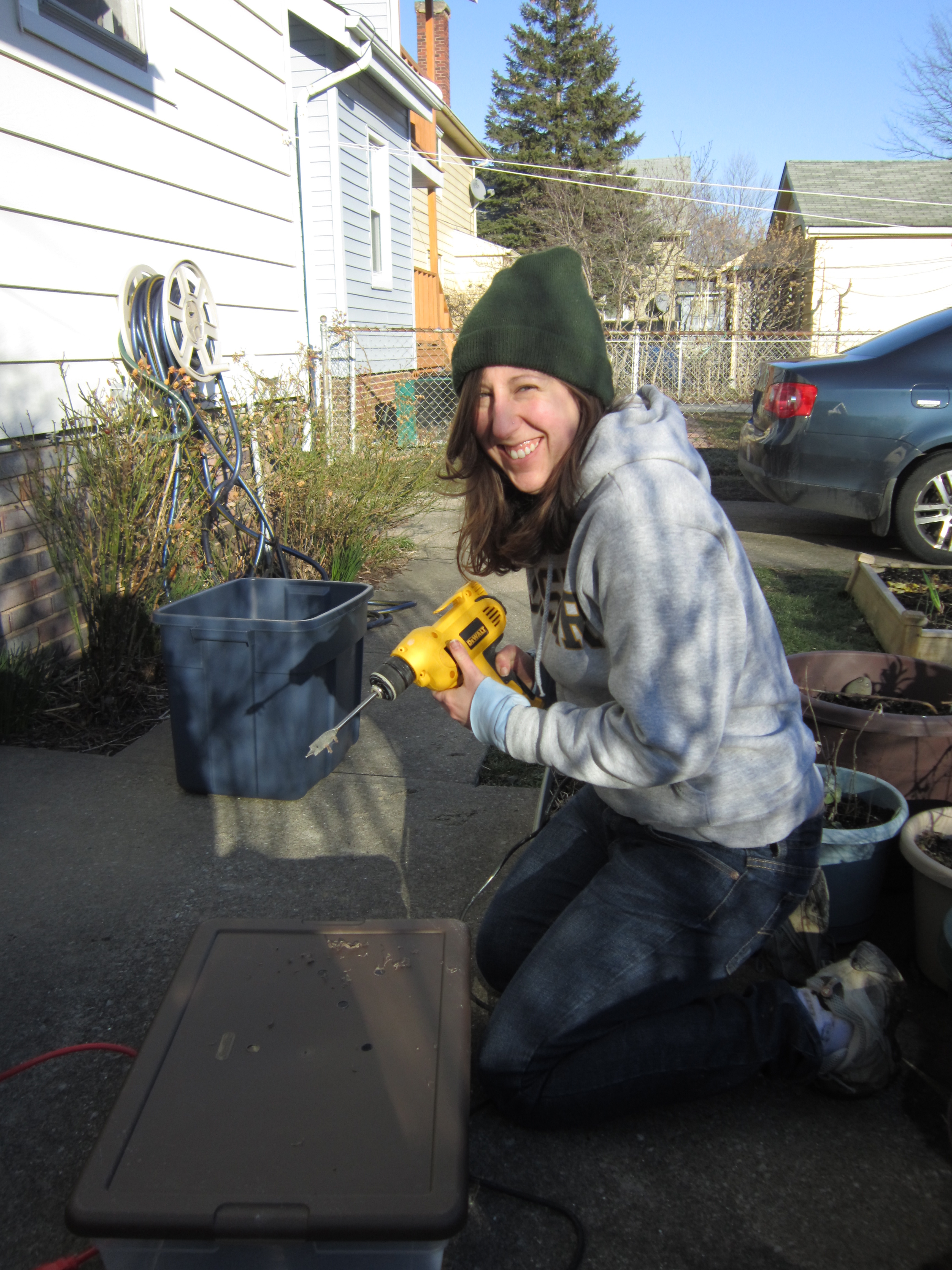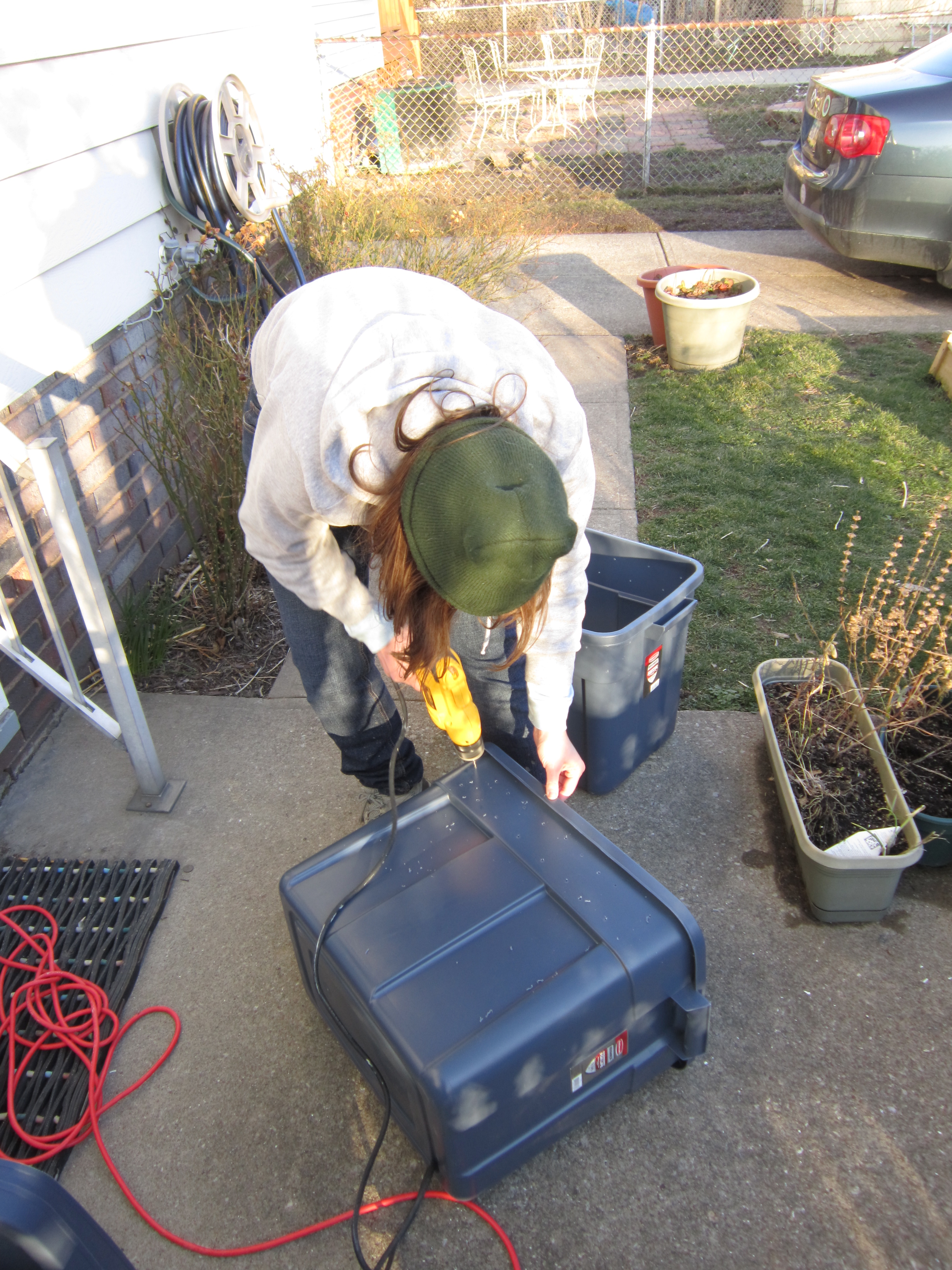 3. Then we started working on the larger bins. We drilled air holes around the perimeter of the top and drainage holes along the bottom. We also drilled some larger holes in the bottom so that the worms have an easier time of migrating upward when the bins are rotated. The idea with the double bins is that we will start one bin, and when that bin is full, it is moved to the bottom, and a new bin is started on top. As the worms continue to compost the remaining matter on the bottom, they will gradually move up to the top bin when there is more to eat. After about 3 weeks, the bottom bin should be fully composted and ready to be used. It is my understanding that the worms will not be tempted to move down and out of the bin as long as there is a yummy environment for them. However, they should move on up when living conditions become better there. Sounds like we could create a TV show.