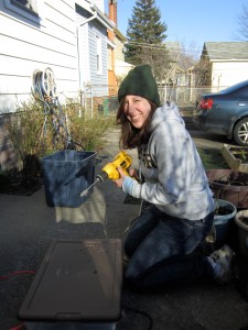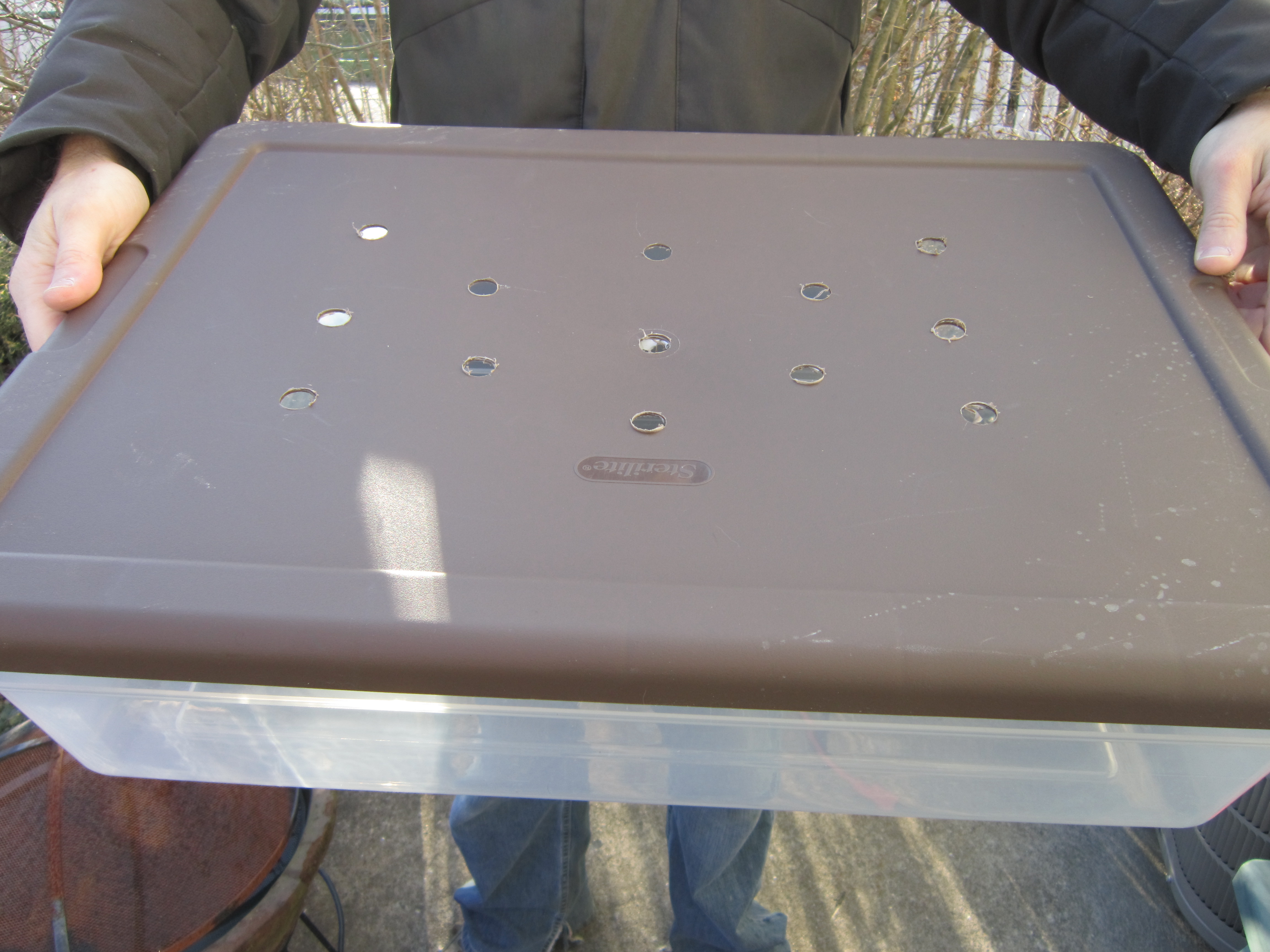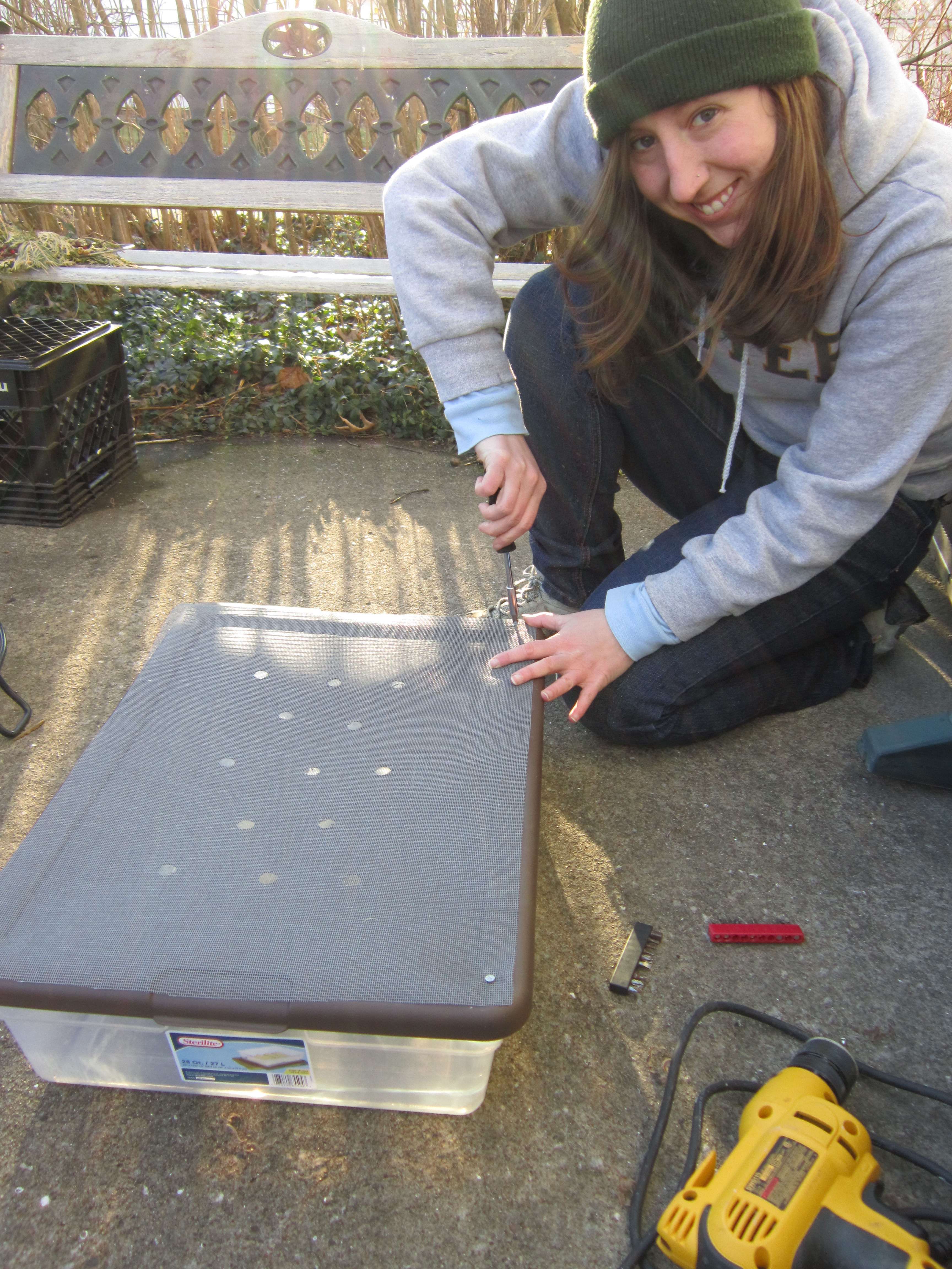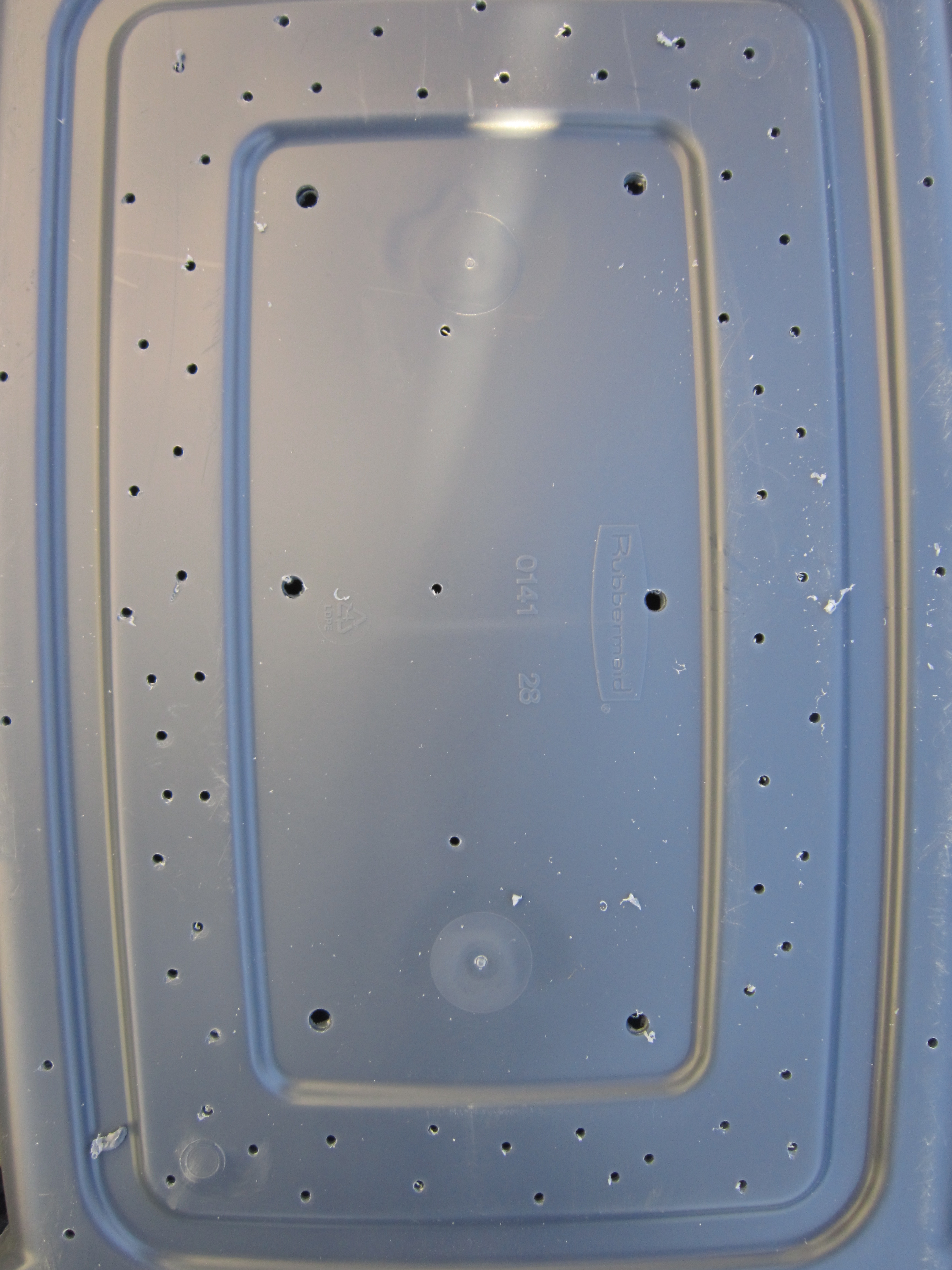 - We started by drilling 1/4″ holes into the lid of the bottom bin to allow worm tea to drain in. We liked the idea of getting a clear bottom bin so that we can see if/when this bin needs to be changed. We also measured out some screen to screw onto this lid so that no worms could fall into this bin.