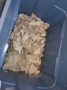 4. Next, we improved the living conditions — we added some interior decorating, if you will. Many people use paper shredded by a paper shredded or other forms of fibrous material (coconut fiber), but my worms are a little thriftier and like paper ripped by hand. This serves as the worms’ bedding. We put a little soil on top of this and moistened everything. Worms should not dry out, but they can drown and do not like to be soaking wet so make sure to go easy on the water. They might try to escape if they feel like they’re living in a lake.