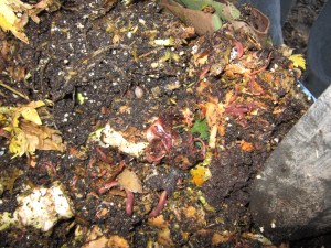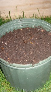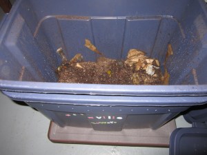 Once this bin seems full, I’ll switch the bins so that the one shown here (now on top) is on the bottom. I’ll have new bedding and some soil ready for the worms in the (new) upper bin, take a couple of them from the bottom bin up there to get things established, and start adding new scraps. The worms should migrate and reproduce so that the top bin is the “working” bin again while the bottom bin is “ripening”.