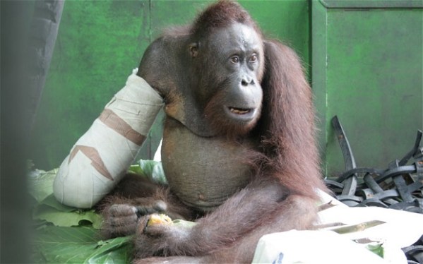 This orangutan chewed off its own arm to escape a trap set in a palm oil plantation. Luckily, it was found and saved before dying. It will likely be re-released into the wild. Photo: Caters. Click on photo to link to article.