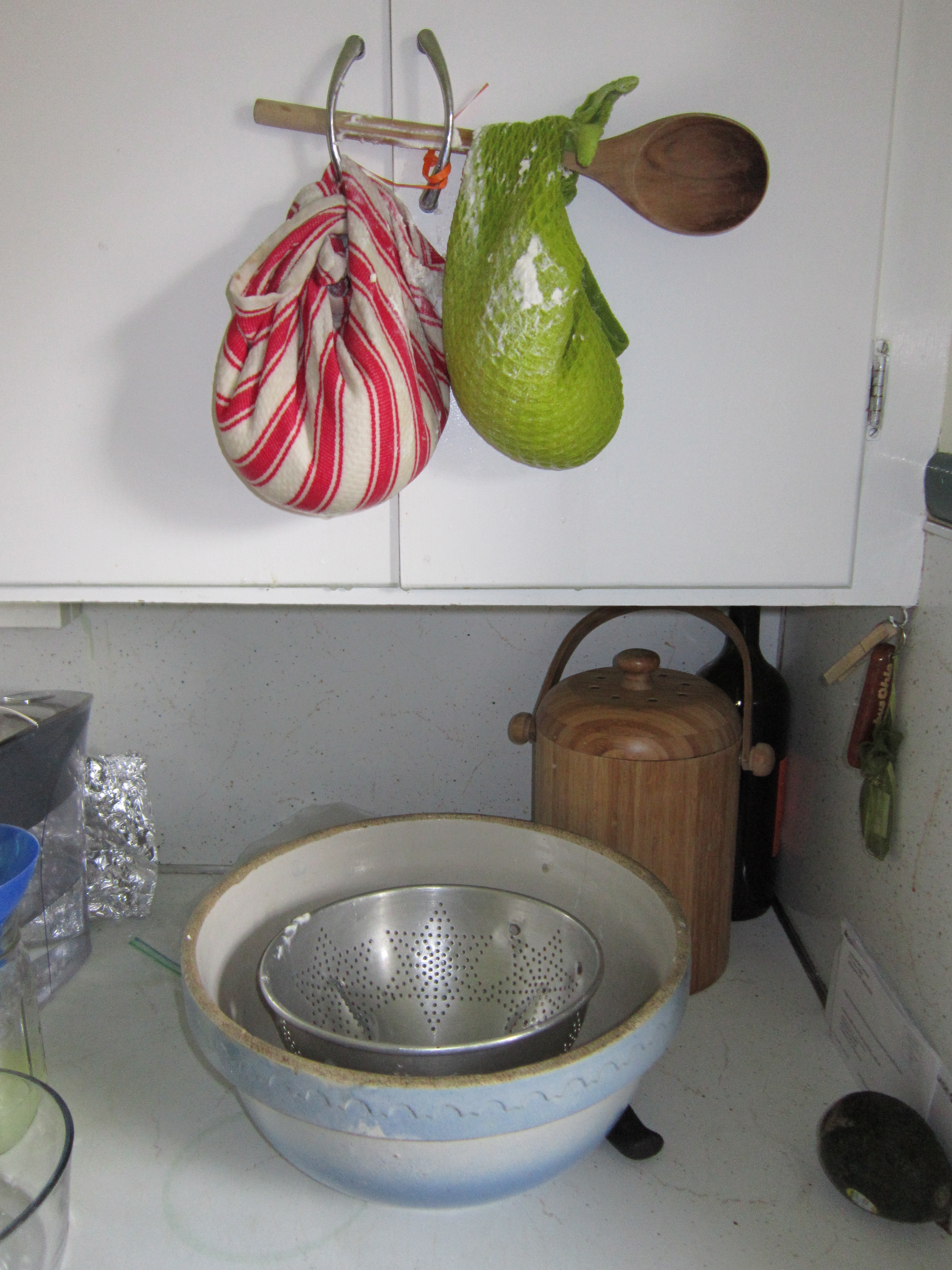 The next morning, I realized that so much whey had drained out that the bottom of the cheese was getting wet in a puddle of whey. I got a bit creative to let a little more whey drain out.