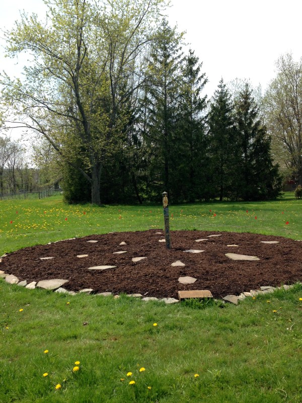 - We sheet mulched a space for the medicine wheel garden in the fall, added more mulch this spring, and it is ready to be planted.