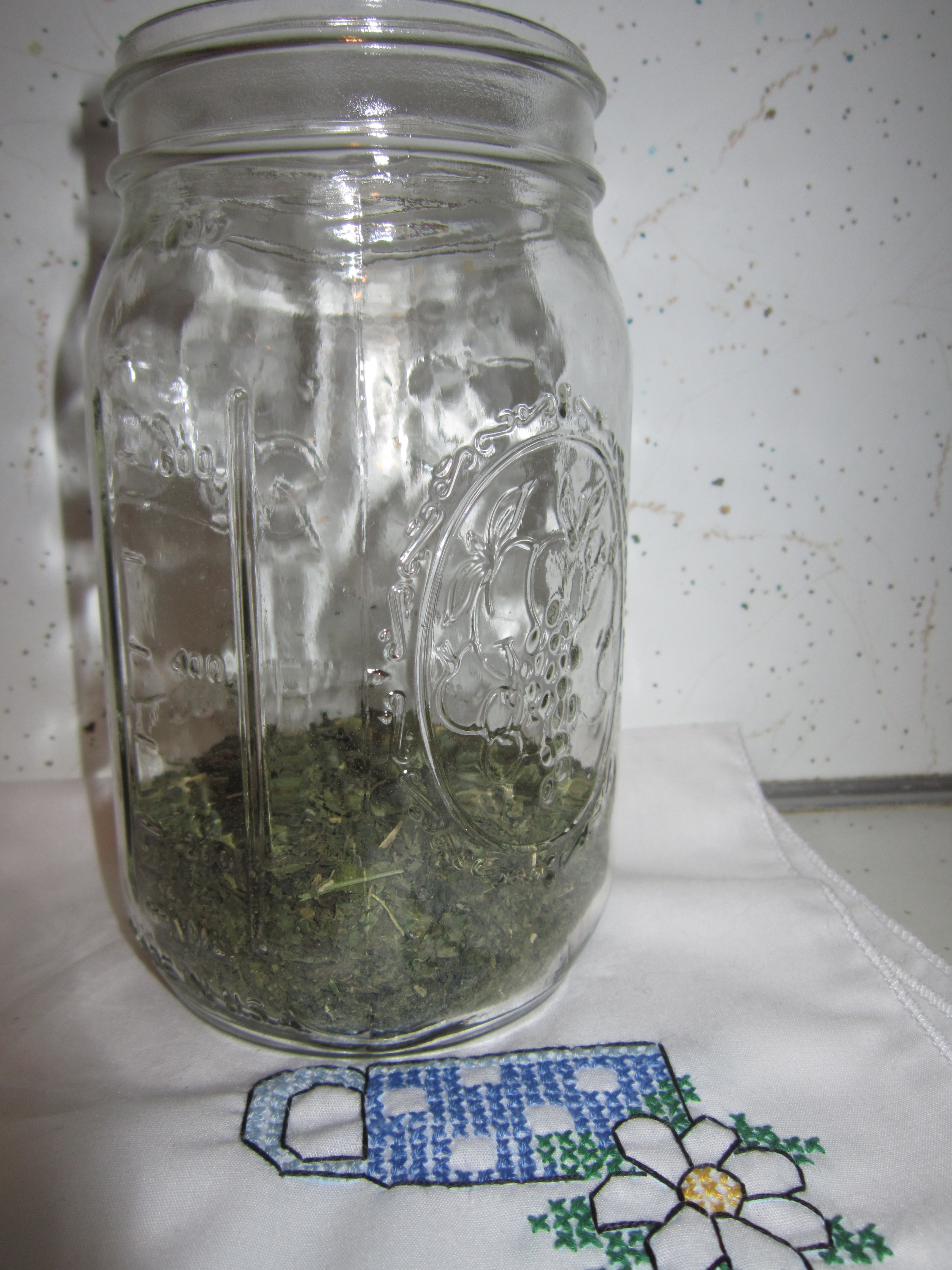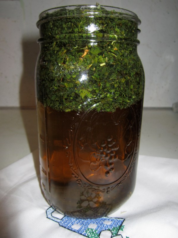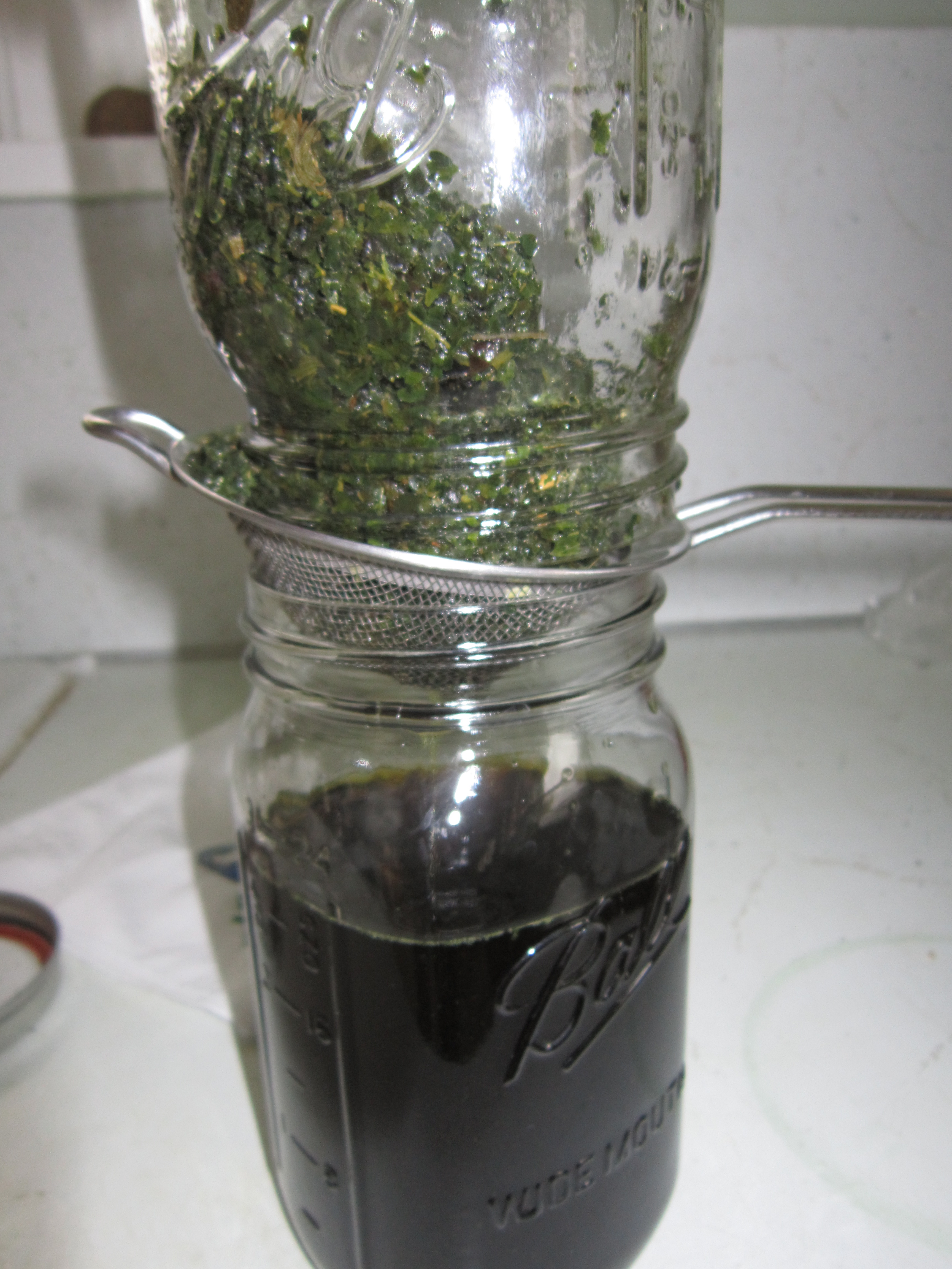 In the morning, I strain the herb and drink the resulting infusion throughout the day.  I drink it cold and straight out of the fridge, but it could also be warmed.  When I first started drinking nettle I added honey a few times to see if I preferred it that way (I didn’t, but I know that others do.  Mint is also a popular addition — just add a tablespoon to the ounce you measured out.).